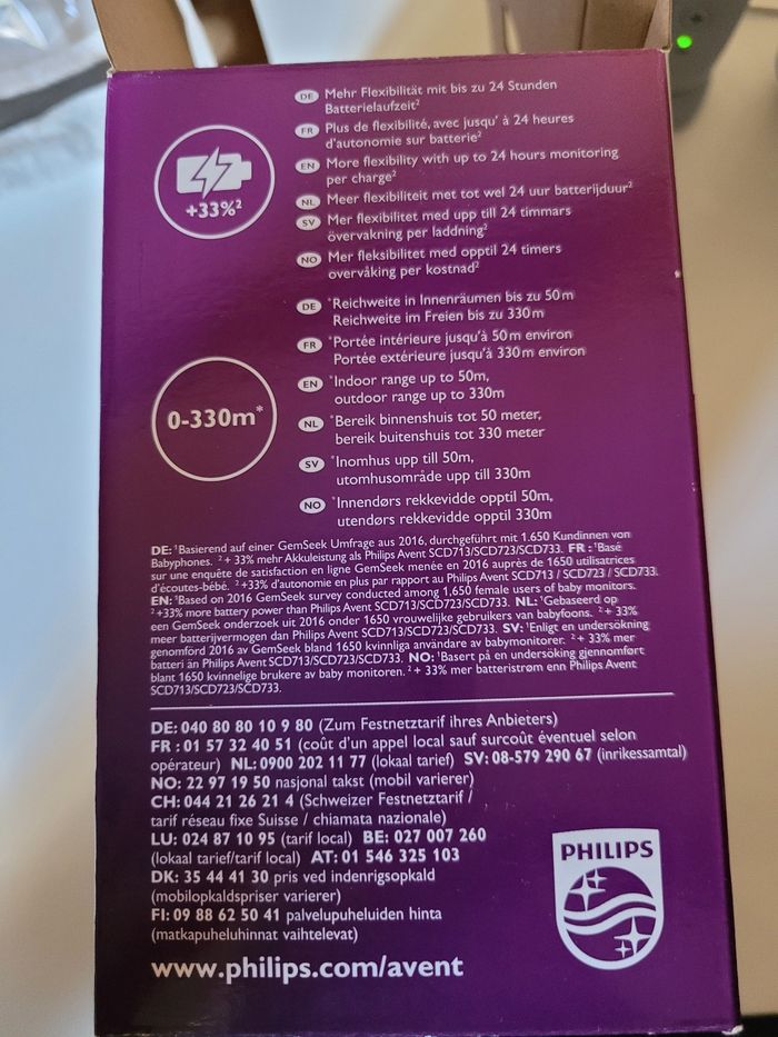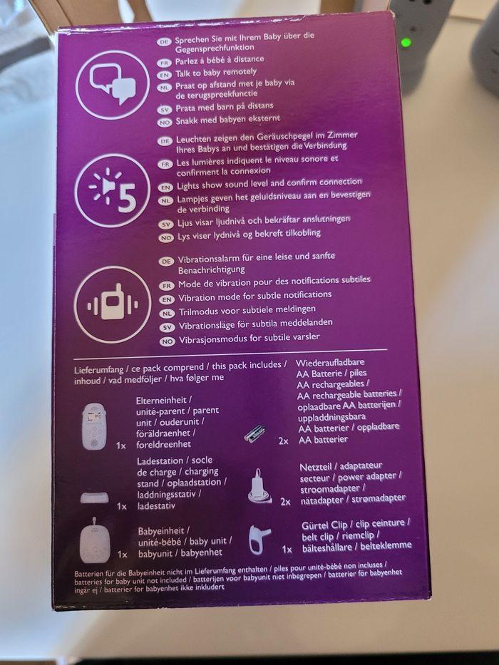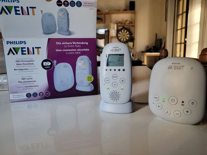 Babyphone Philips Avent en bon état Donne la température Possibilité de parler à bébé à distance 5 berceuses Veilleuse Nécessite le changement des piles rechargeables (AA) sur l'unité parent (cf avant dernière photo) Possibilité de mettre 4 piles dans l'unité bébé pour les voyages.