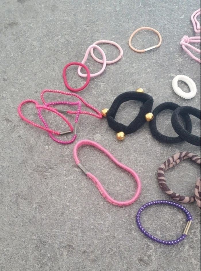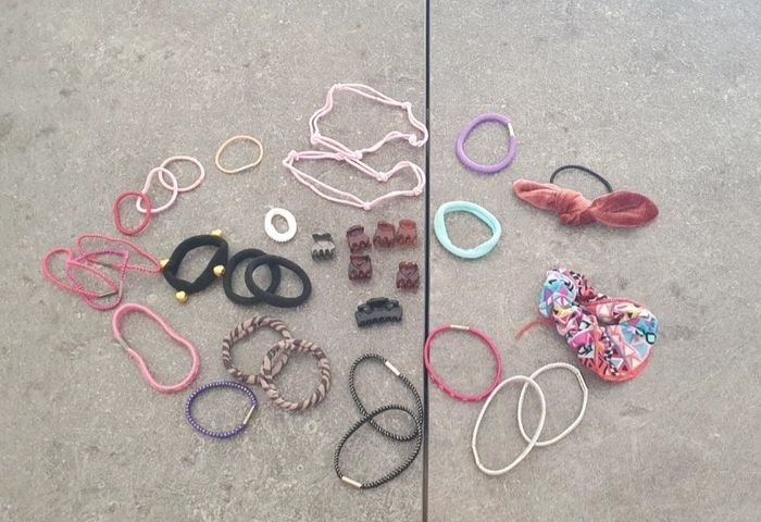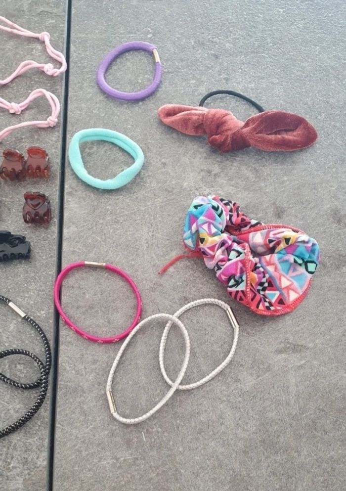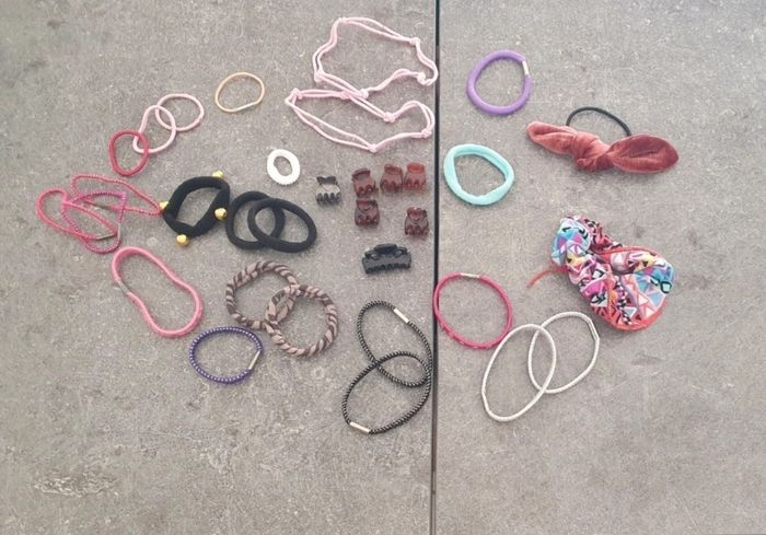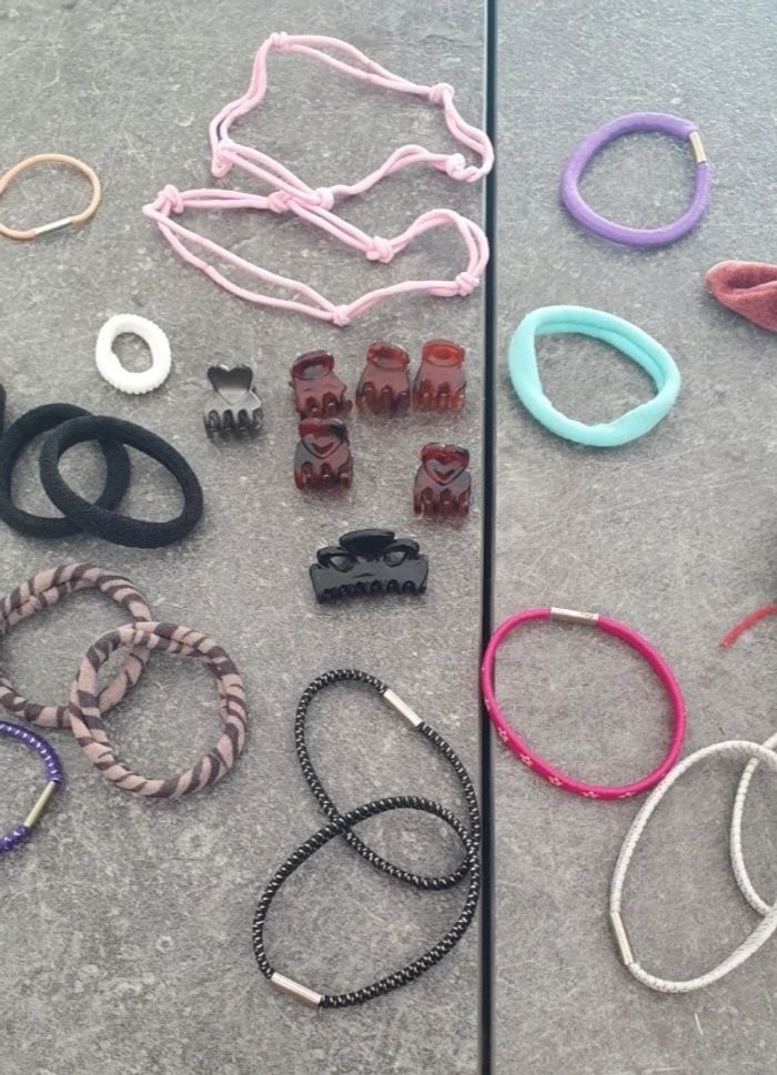 Je vends ce lot d'accessoires pour cheveux composé de divers élastiques, pinces et barrettes de différentes couleurs et motifs. Neuf ou en très bon état.