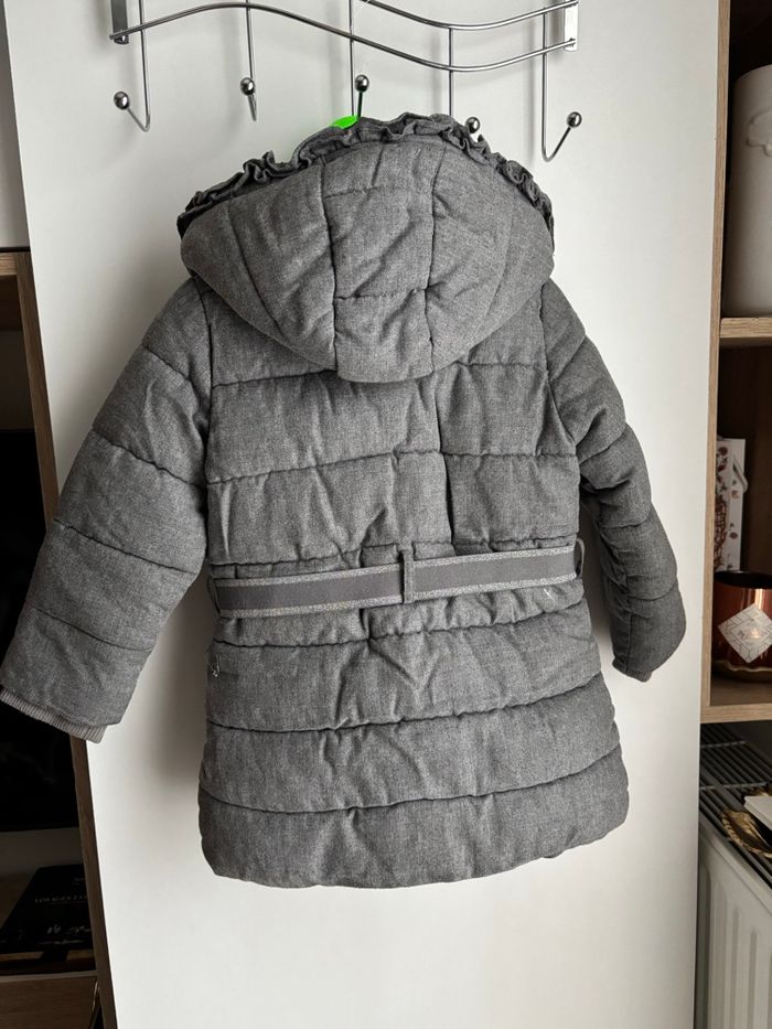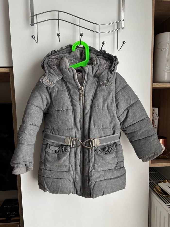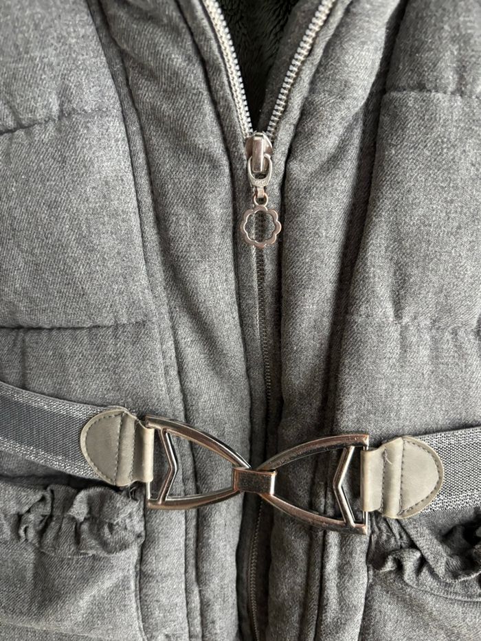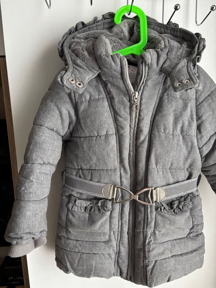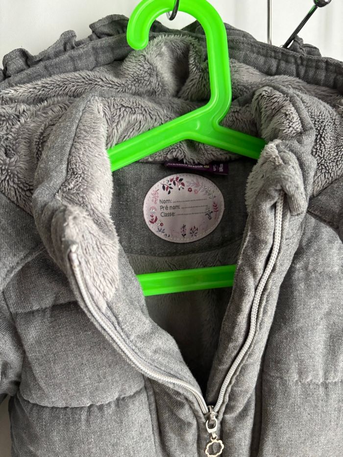 Doudoune capuche sergent major grise chaude Ceinture à la taille légèrement peinture argenté parti Fermeture à zip Cordon à l’intérieur Fourrure en haut et dans la capuche En tissu Deux poches fille 4 ans
