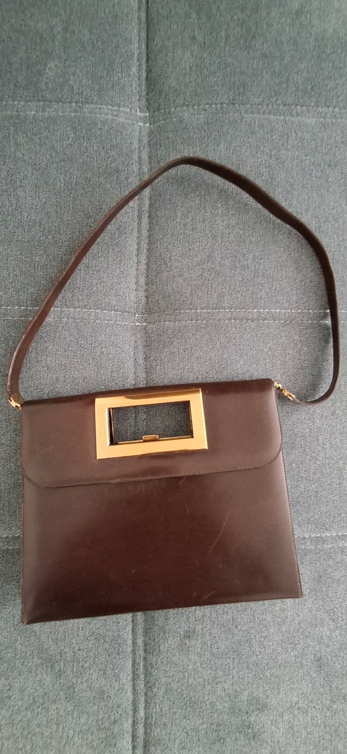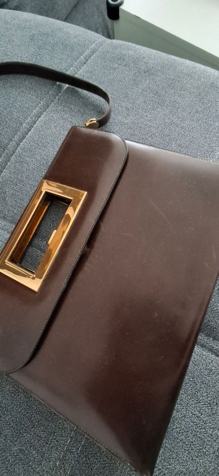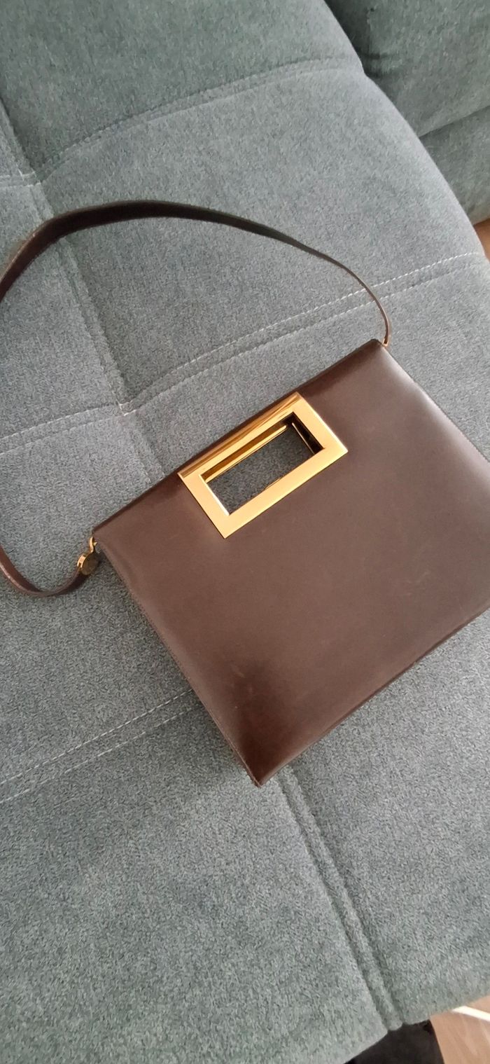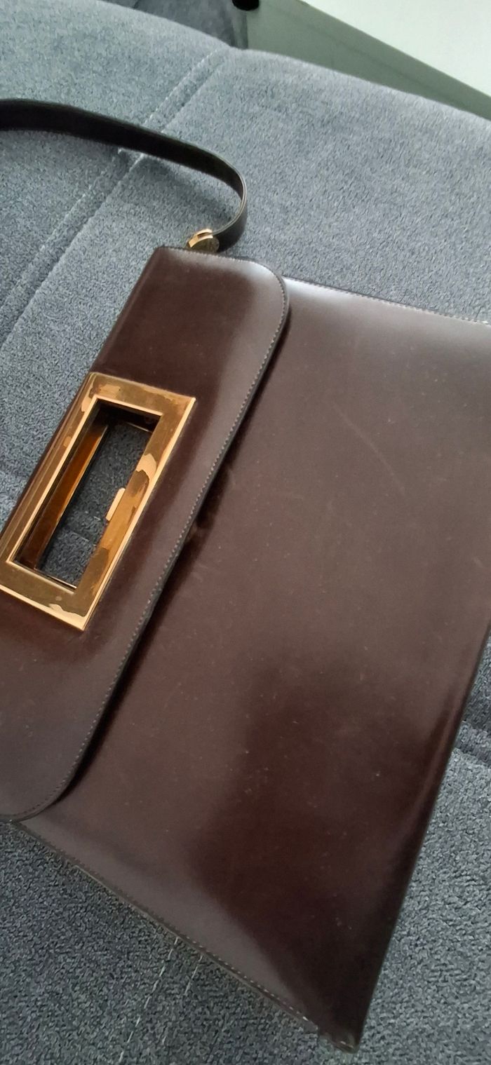 ​Superbe sac à main vintage de la maison GUCCI, pièce de famille rare des années 60-70. ​Particularité : Modèle fabriqué en France sous licence Gucci (marquage doré d'époque à l'intérieur). C'est une pièce de collection car la production a ensuite été totalement centralisée en Italie. ​Design : Cuir de veau lisse type box marron profond, ligne épurée avec un magnifique fermoir bijou rectangulaire en métal doré. Très chic et intemporel. En parfait état de fonctionnement. Intérieur : doblure en cuir / suède avec logo G et blason. Il se porte aussi bien à la main qu’a l'épaule. ​Détails : Tirette de zip intérieure en forme de "G". ​État : Très bel état pour son âge. Le cuir est sain, quelques marques d'usage minimes qui font son charme vintage. ​Dimensions : 25x20 cm et 5cm d'épaisseur au pus épais. ​Idéal pour les collectionneurs ou amateurs de mode vintage authentique. Envoi soigné ou remise en main 400€ A venir récupérer sur place ou envoi soigné possible via mondial relais.
