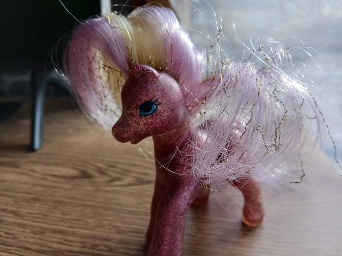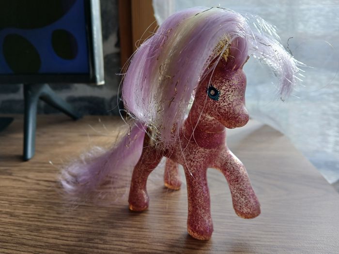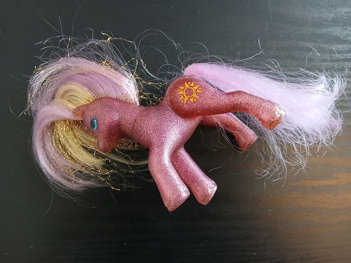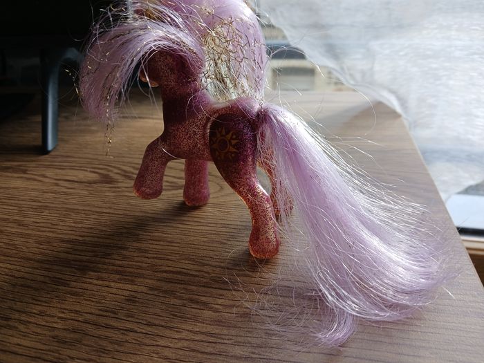 figurine Mon Petit Poney (Hasbro) de la Génération 3 (G3). ​Il s'agit du modèle Reine Soleil (Starbeam), une version spéciale et recherchée pour ses caractéristiques uniques : ​Corps : Rose translucide rempli de paillettes ​Articulations : Pattes arrière articulées ​Symbole : Soleil jaune orangé parfaitement conservé. ​État : Bon état général. La crinière et la queue sont mauves et blondes avec des fils dorés. À noter que les cheveux sont d'origine et pourraient bénéficier d'un petit soin pour retrouver leur souplesse.il manque un strass sur l un des yeux