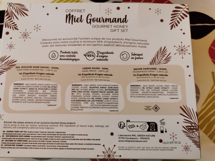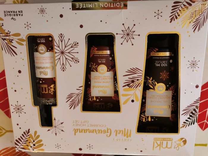 coffret miel gourmand de chez MKL edition limitee fabrication française un gel douche de 100ml, une crème pour les mains de 50 ml et une brume parfumée de 100ml. produits neufs, non entamés et non déballés