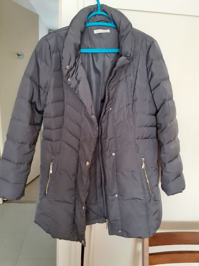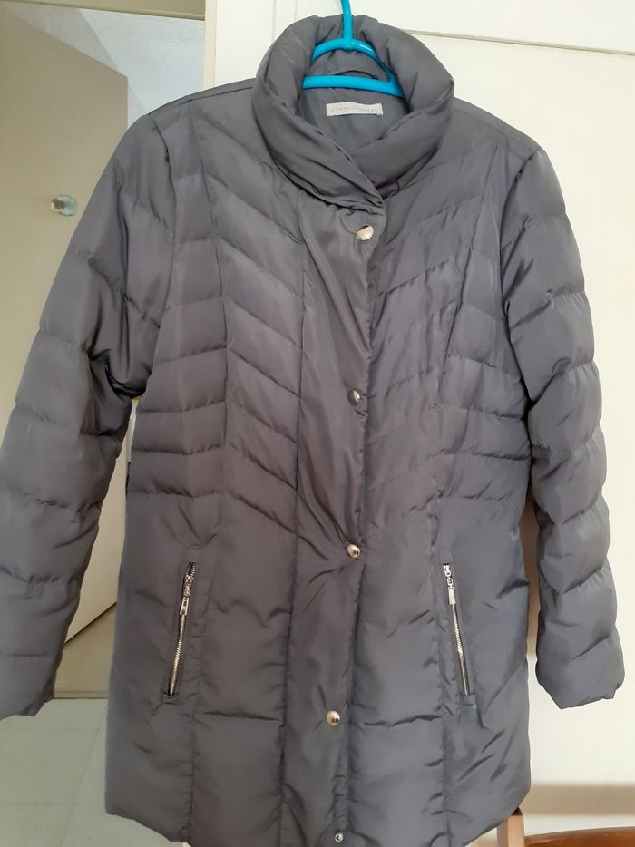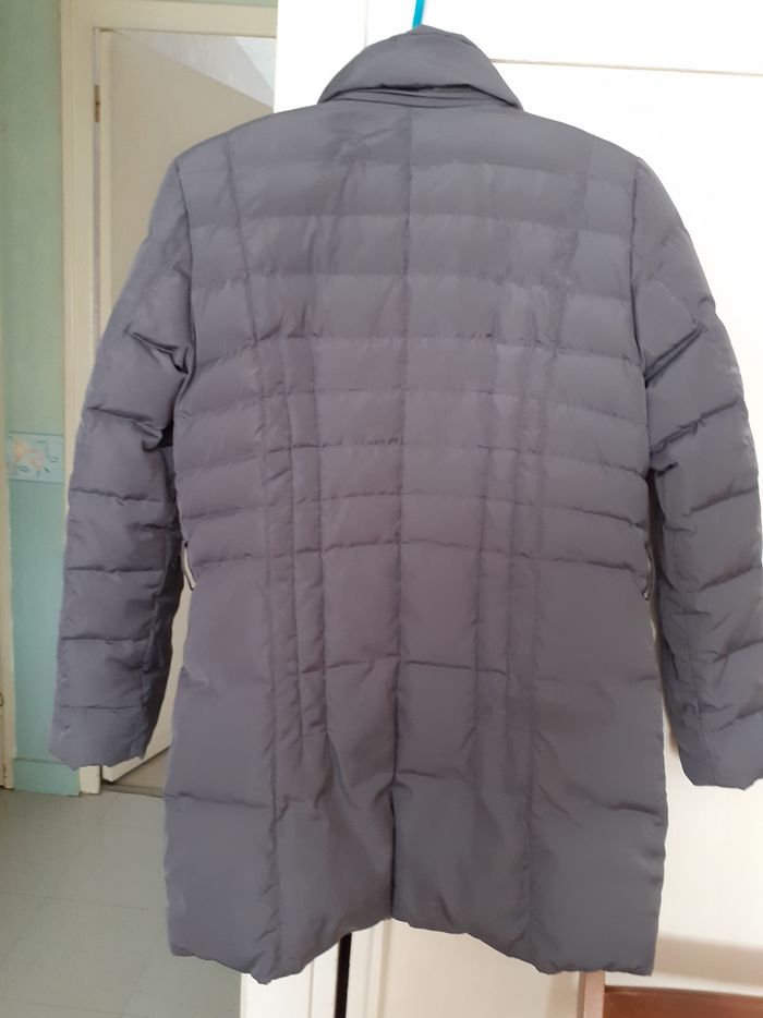 Doudoune longue gris. Ouatiné en plume. Poches doublées polaires col montant.