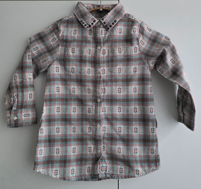 Chemise de marque Tape à l'Oeil, taille 4 ans, 100% coton. Motifs dans les tons turquoise / crème / marron. 2 poches poitrine, 1 bouton de rechange.