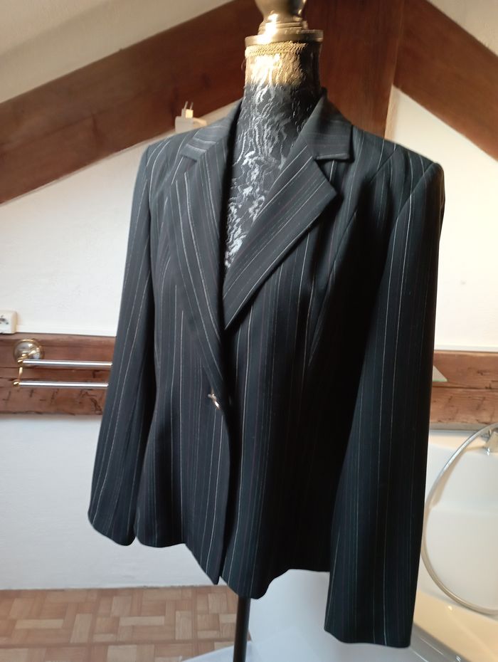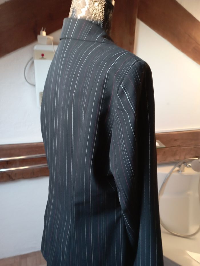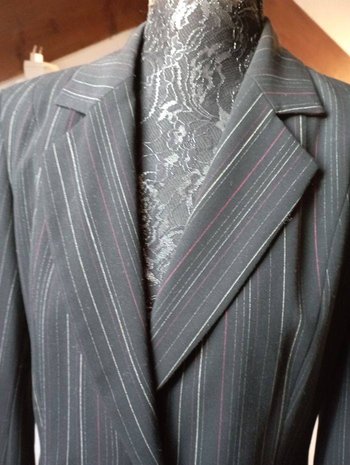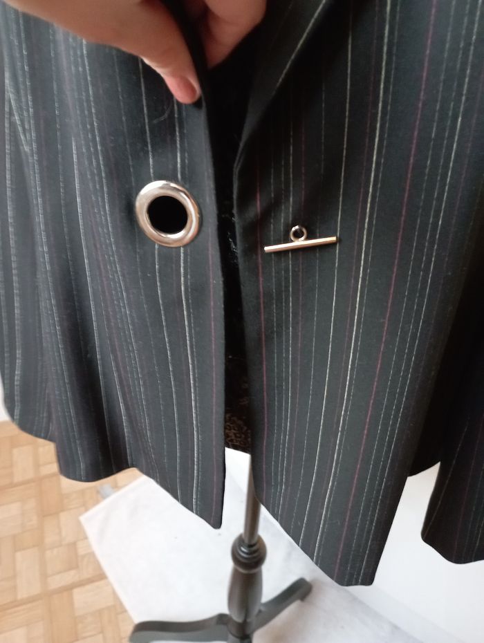 blazer / veste noire avec des "traits" légers se ferme sur le devant par un bout métallique que l'on glisse dans le rond épaulettes discrètes au niveau des épaules marque la city taille 4 60 % polyester, 35 % viscose et 5 % élasthanne doublure 100 % polyester en très bon état pour plus de renseignements, n'hésitez pas à me faire un message j'étudierais toute proposition que vous me feriez