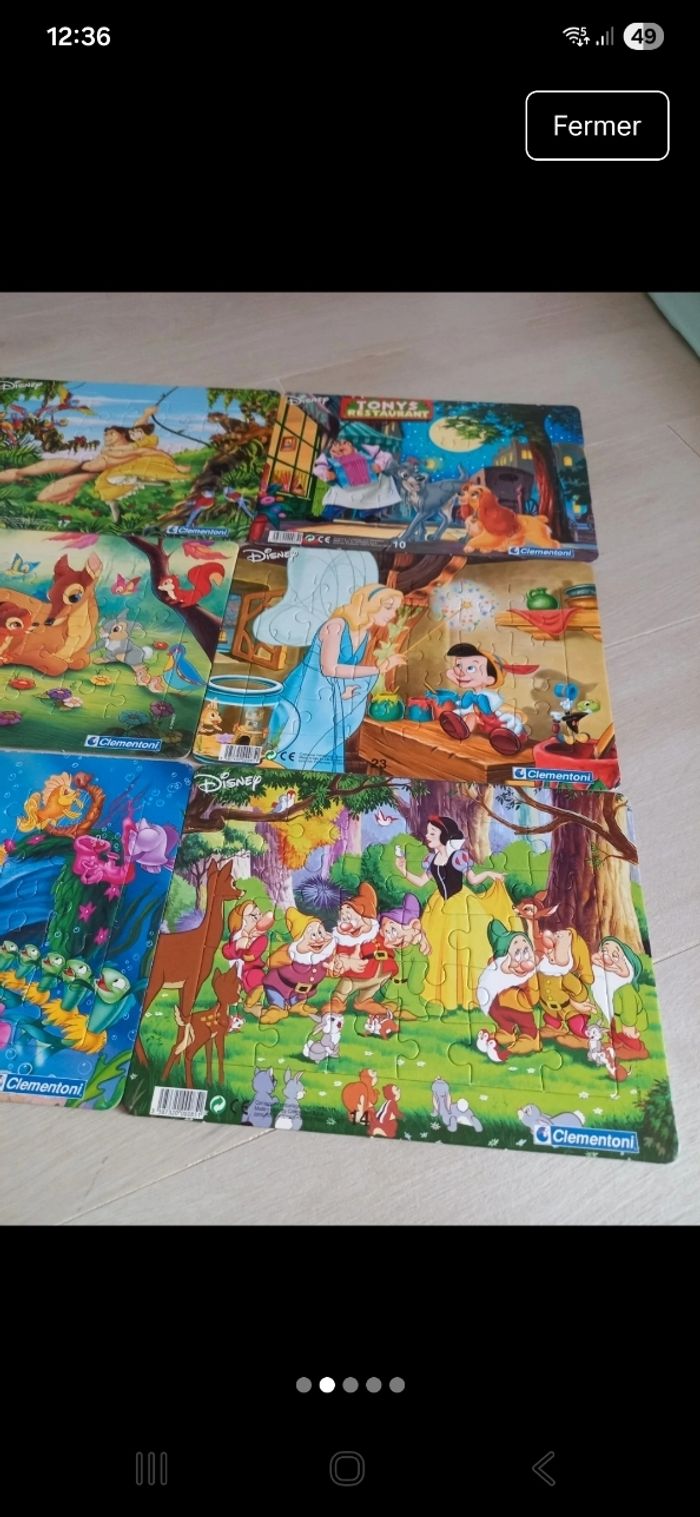 Lot de 6 puzzles plats de 30 pièces chacun en superbe état quasiment comme neuf. 1 puzzle roi lion en cadeau car il manque 1 pièce.