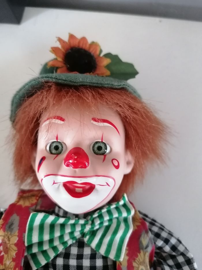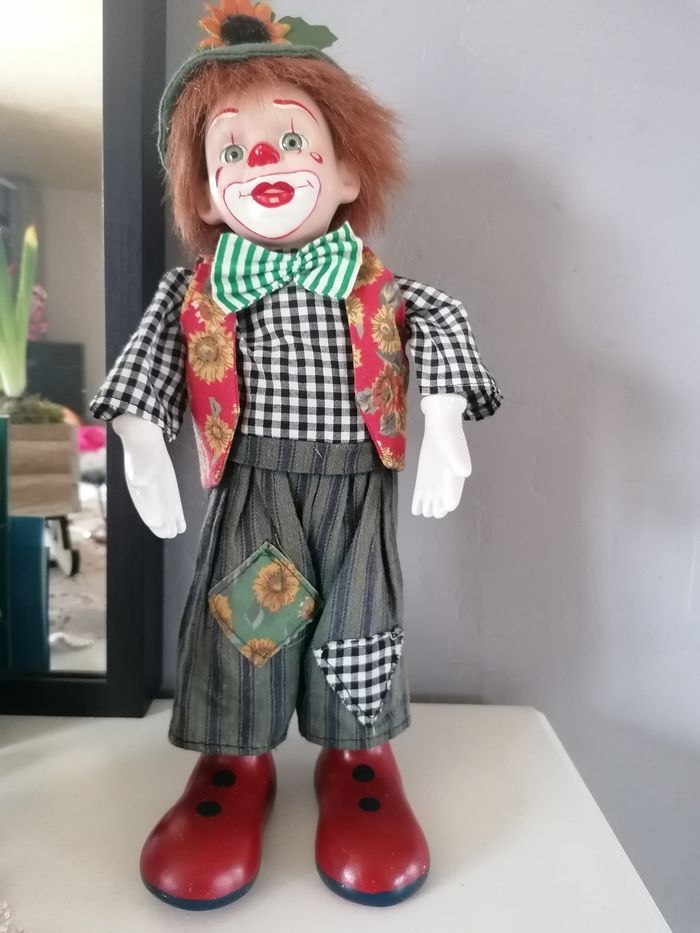 Clown en tenue de jardinier Parfait état de fonctionnement Automate Remontoir En parfait état Émet 1 douce mélodie la lettre à Lisa Bouge les bras et la tête Hauteur 34cm de haut Tête mains et bottes je pense que c'est de la porcelaine