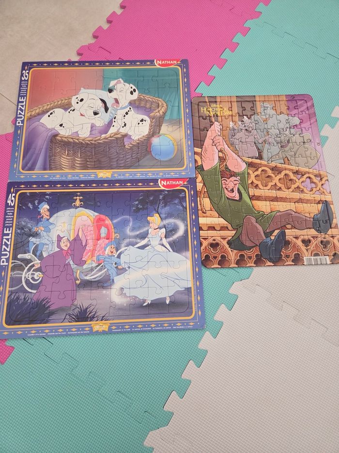 3 grands puzzles Disney (35x30cm). 35, 45 et 100 pièces en super état. Juste quelques coins légèrement abimés.