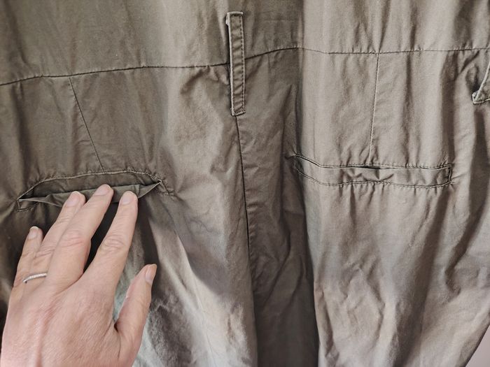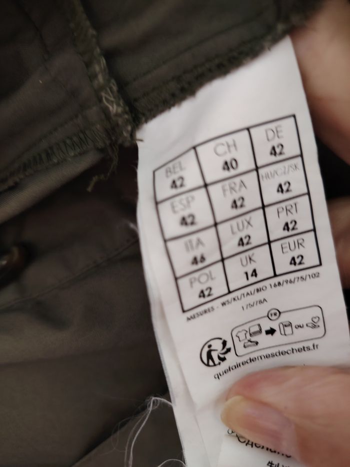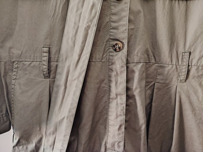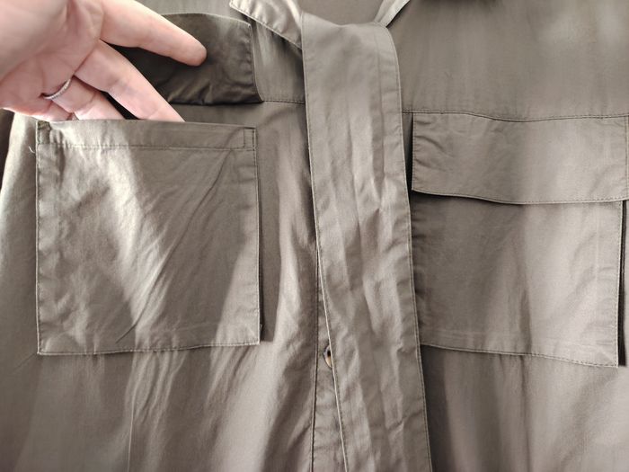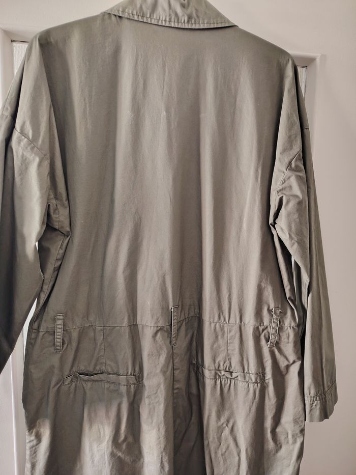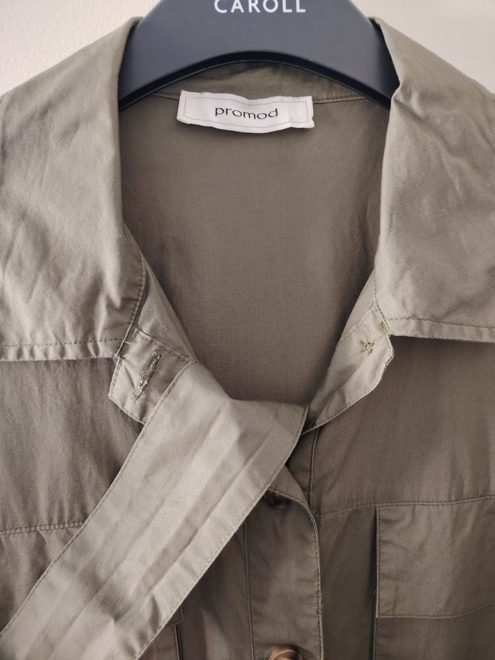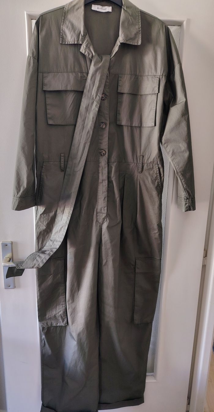 Bonjour, Combinaison Promod portée 3 fois, a porter avec ou sans le revers Couleur kaki style militaire Fermeture devant par boutons jusqu'à la taille, avec ceinture Jambes larges coupe droites 2 poches poitrine et sur les jambes ouvertes 2 fausses poches derrière Manches longues Taille 42, 100% coton, lavage à 30° Envoi rapide et soigné 😉