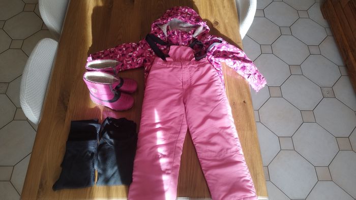 Blouson 5 ans mais taille grande Salopette ( un peu tâché a l'entre jambe) 2 dessous pantalon+ 2 Tee shirts,(bouloché mais en bon état) Botte taille 29. Le tout a bien servi mais en bon état.