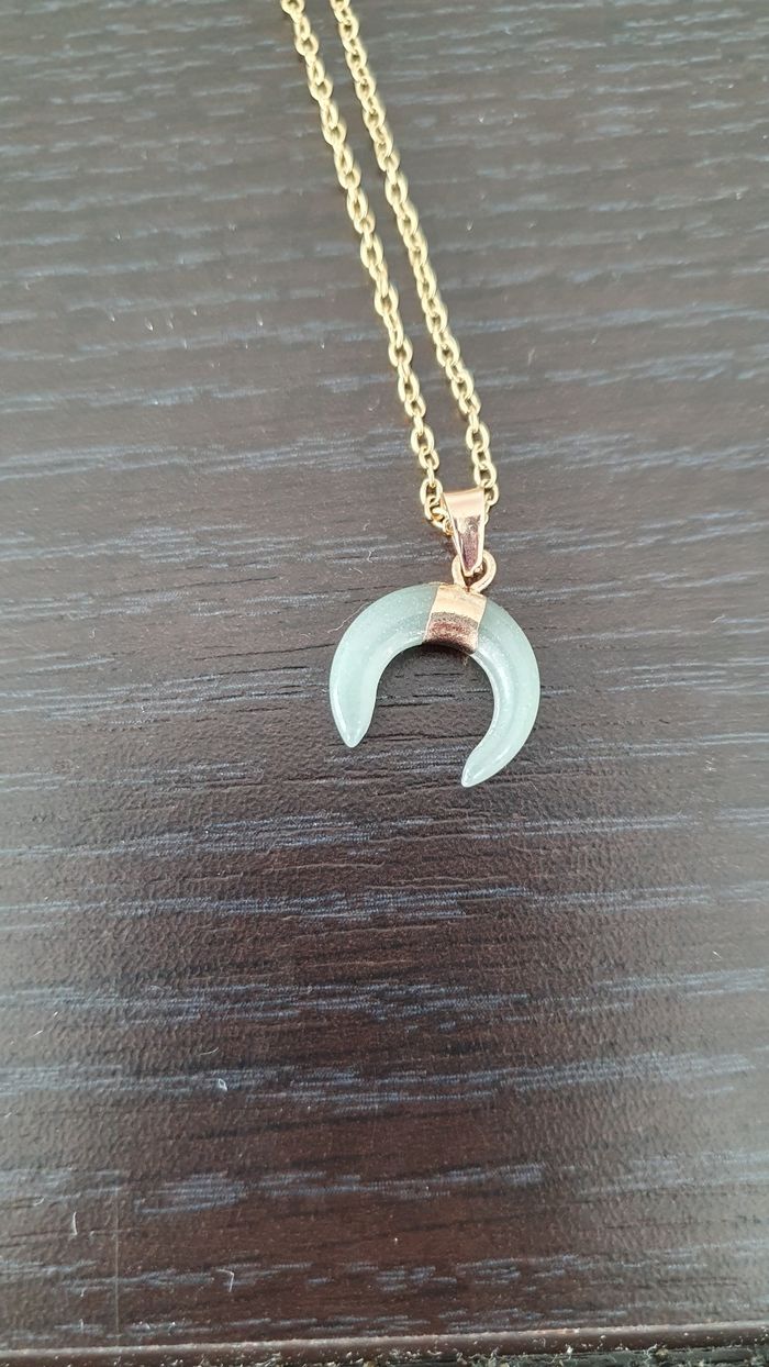 Je vends ce collier neuf avec un pendentif en forme de lune verte. Chaîne ajustable.