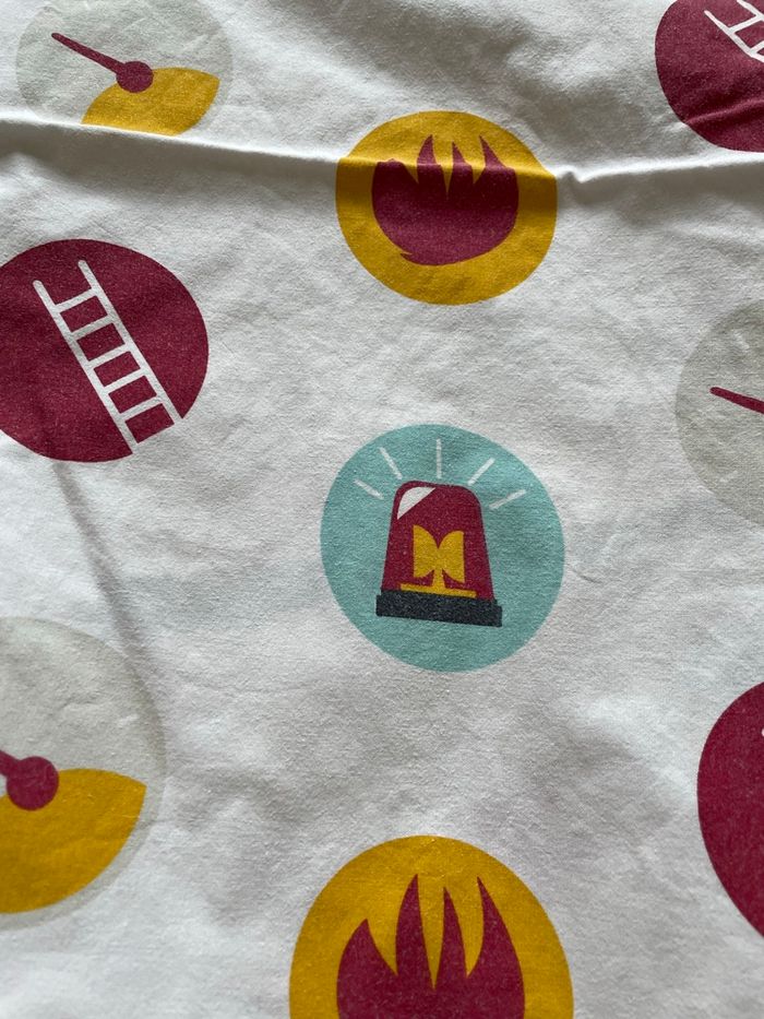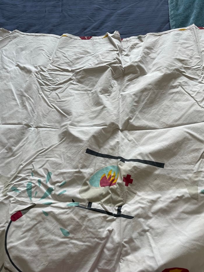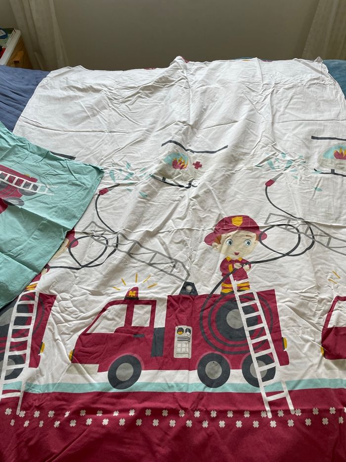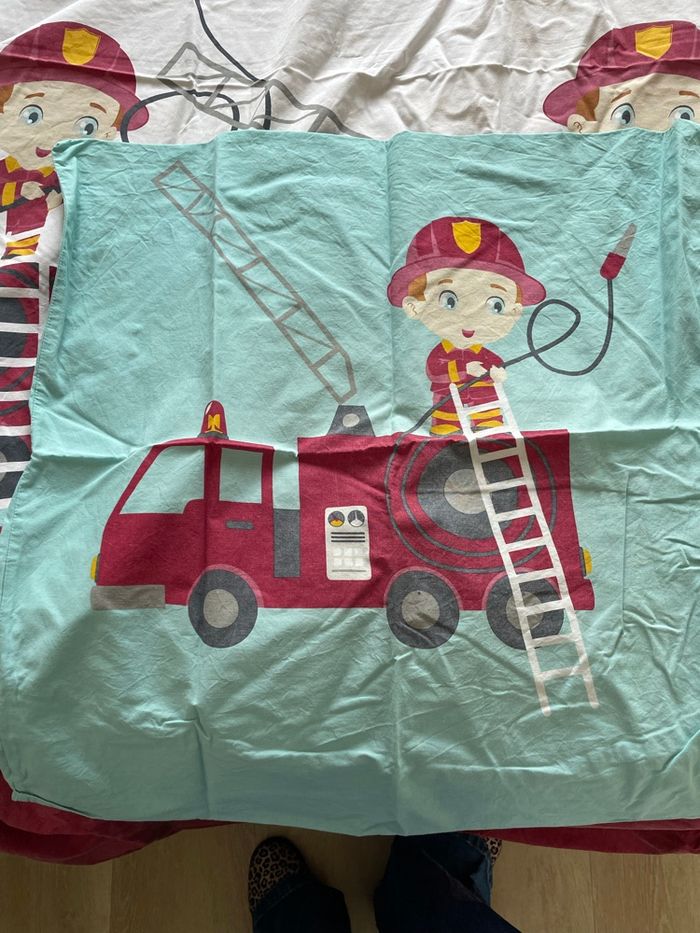 Drap pour lit enfant sur le thème des pompiers Pas de trou ni tache mais couleurs un peu passées Taie d’oreiller 65x65 cm Drap housse 140x200 cm