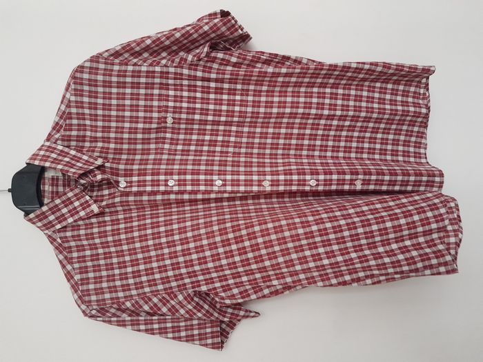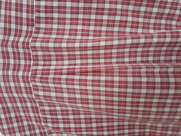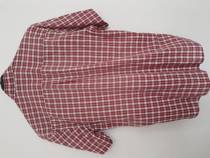 Chemise à carreaux, manche courte, poche sur poitrine avec bouton, bouton sur col, plis au milieu du dos, de forme arrondie sur le bas Longueur : 76cm Aiss / Aiss : 57cm Matière : 100 % Coton Marque : sans étiquette