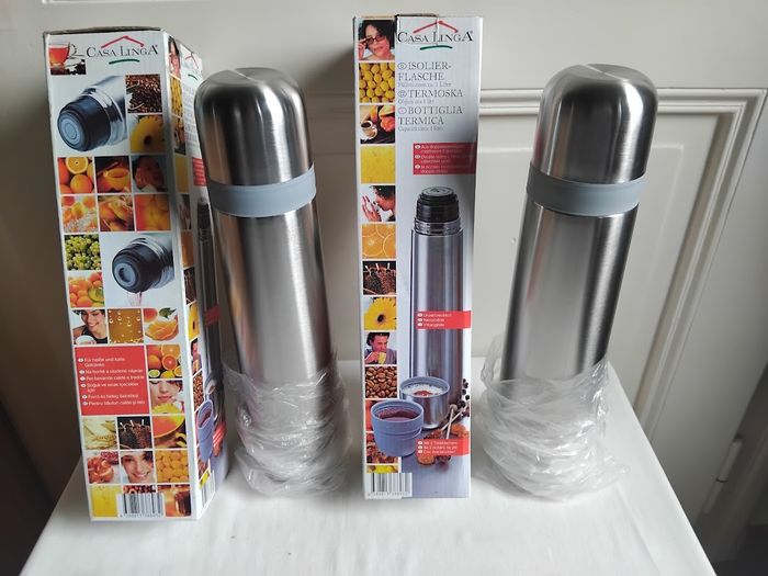 **Articles NEUFS** Lot de 2 Bouteilles isothermes en inox d'une capacité de 1 litre. Matière : Inox Capacité : 1 L Couleur : Argenté État neuf sous emballage d'origine