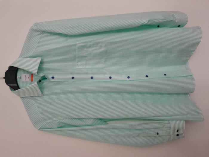 Chemise à rayure, manche longue avec bouton ajustable sur 2 niveaux, poche sur poitrine, plis sur omoplate, de forme droite sur le bas Longueur : 81cm Aiss / Aiss : 62cm Matière : 100 % Coton Marque : Olymp