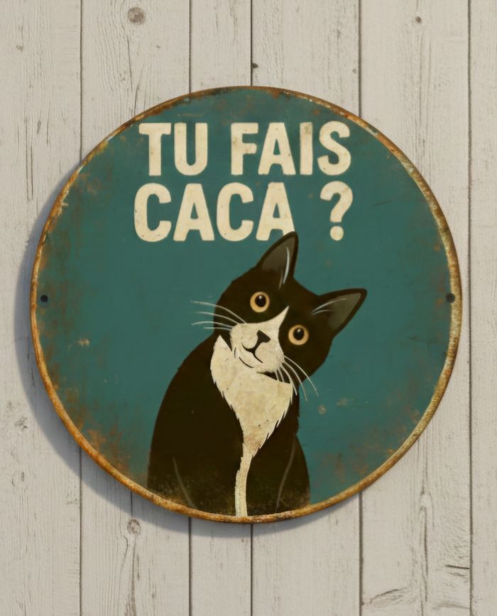Très belle plaque décorative métallique avec chat Dimensions environ 20x20cm Inscription "Tu fais caca ?" Neuve sous blister