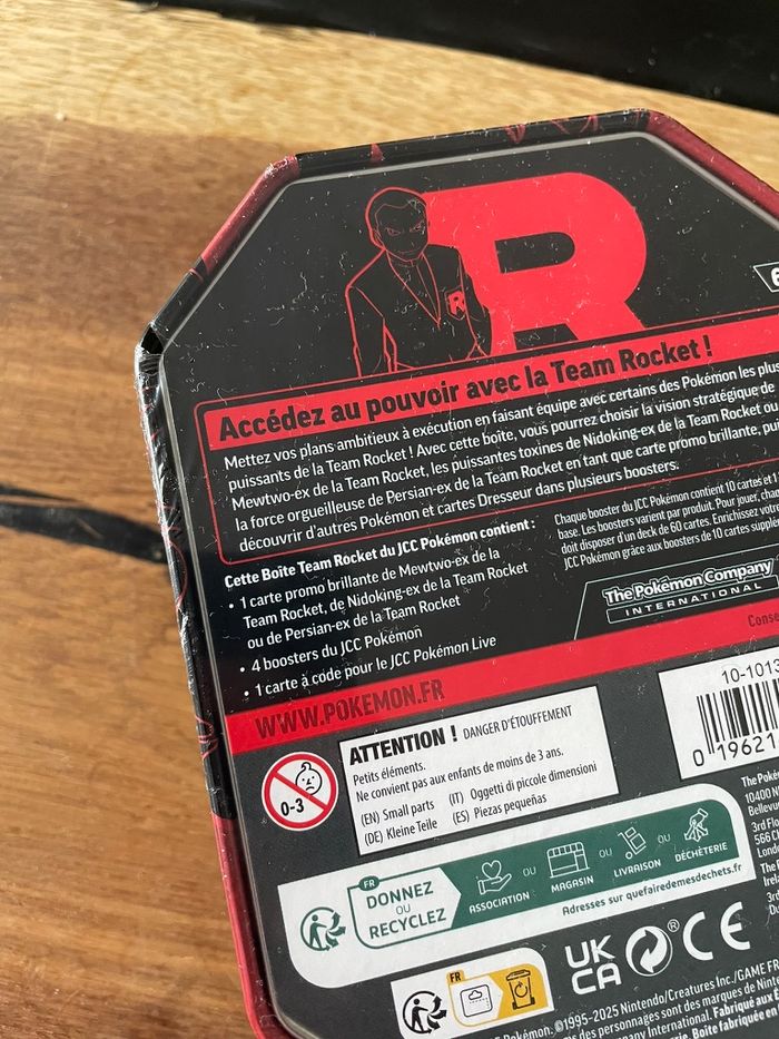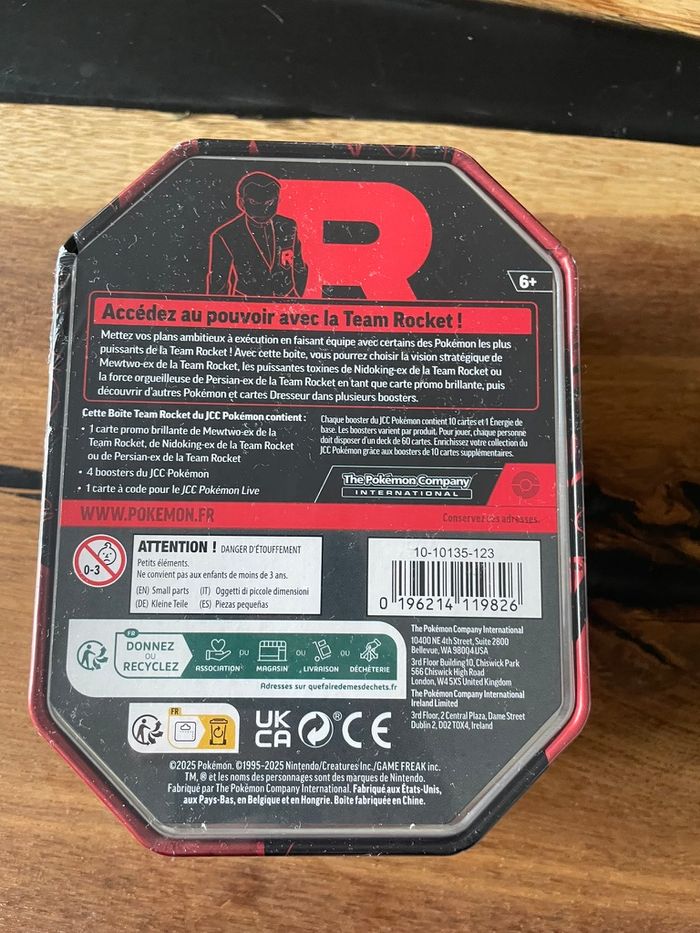 Neuf, sous blister d'origine (Scellé). Parfait pour les collectionneurs de produits scellés ou pour un cadeau ! Contenu de la boîte : - 1 carte promo brillante de Persian-ex. - 4 boosters du JCC Pokémon (dernières nouveautés). - La boîte en métal illustrée, idéale pour le rangement. Envoi : Expédition très rapide. Le colis sera ultra-protégé (papier bulle et carton rigide) pour éviter tout enfoncement de la boîte métallique pendant le transport. #pokemon #pokebox #teamrocket #persian #persianex #ev10 #ecarlateetviolet #cartespokemon #neuf #scelle #collection #jccpokemon #cadeau