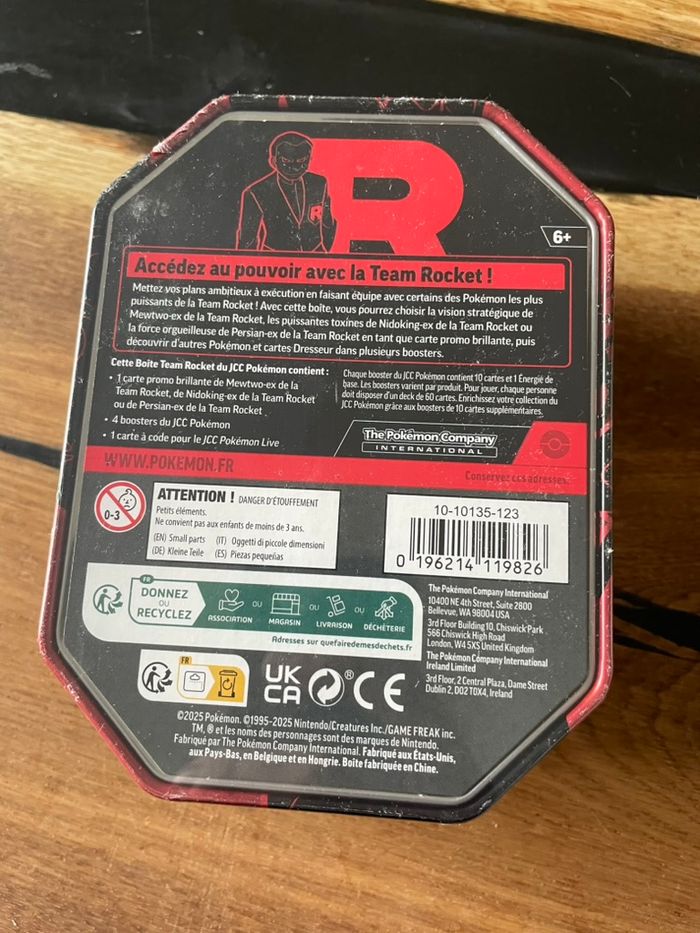 Neuf, sous blister d'origine (Scellé). Parfait pour les collectionneurs de produits scellés ou pour un cadeau ! Contenu de la boîte : - 1 carte promo brillante de Persian-ex. - 4 boosters du JCC Pokémon (dernières nouveautés). - La boîte en métal illustrée, idéale pour le rangement. Envoi : Expédition très rapide. Le colis sera ultra-protégé (papier bulle et carton rigide) pour éviter tout enfoncement de la boîte métallique pendant le transport. #pokemon #pokebox #teamrocket #persian #persianex #ev10 #ecarlateetviolet #cartespokemon #neuf #scelle #collection #jccpokemon #cadeau