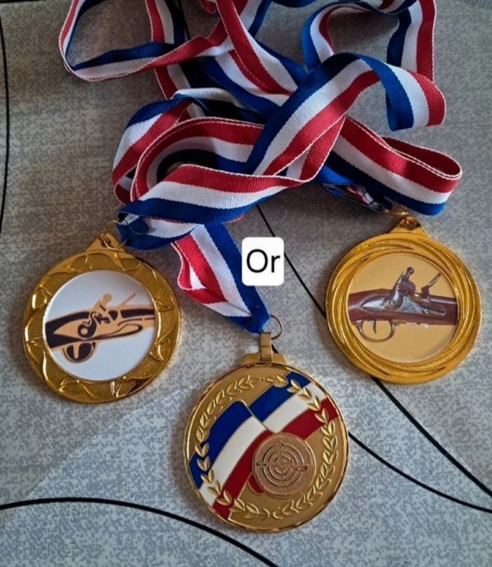 Lot médailles sportives. On peut retirer les autocollants et en mettre d'autres par rapport au sport recherché. Voir détails sur les photos. 5€ les 5 médailles ou 3€ les 3.