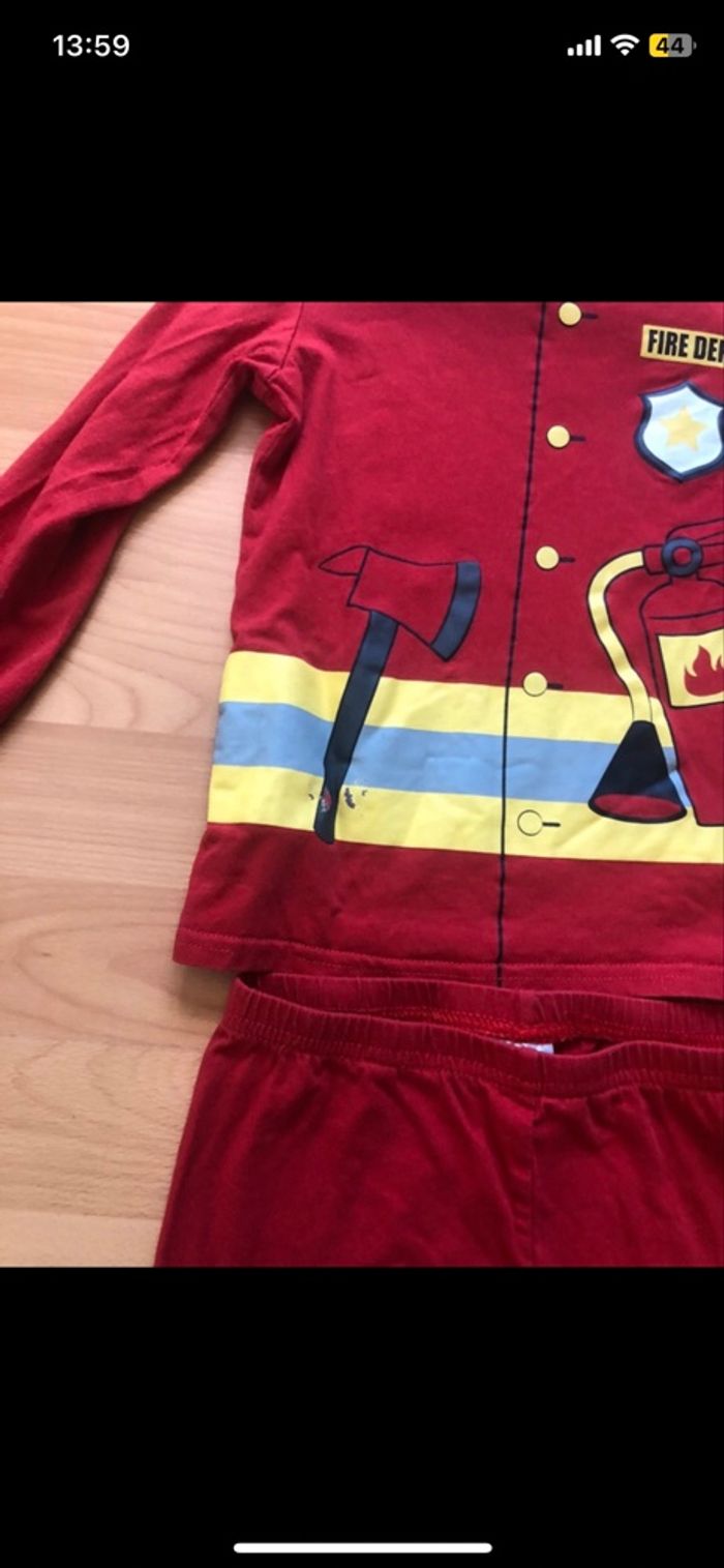 Lot de 11 pyjamas 2 pièces Un pyjama a un trou sur le pantalon, ne compte pas dans le prix Un autre a une marque de tampon de prénom il ne compte pas dans le prix non plus Le dessin du pyjama pompier à colle et s’est un peu enlevé il est à 1€