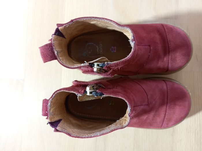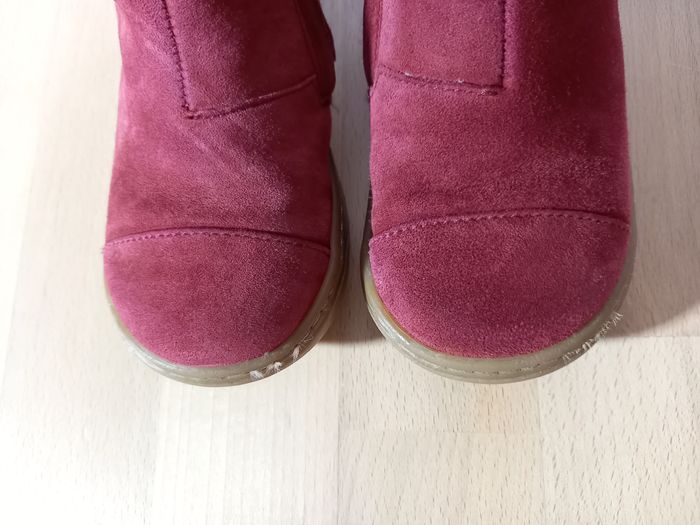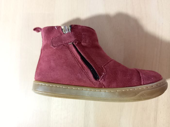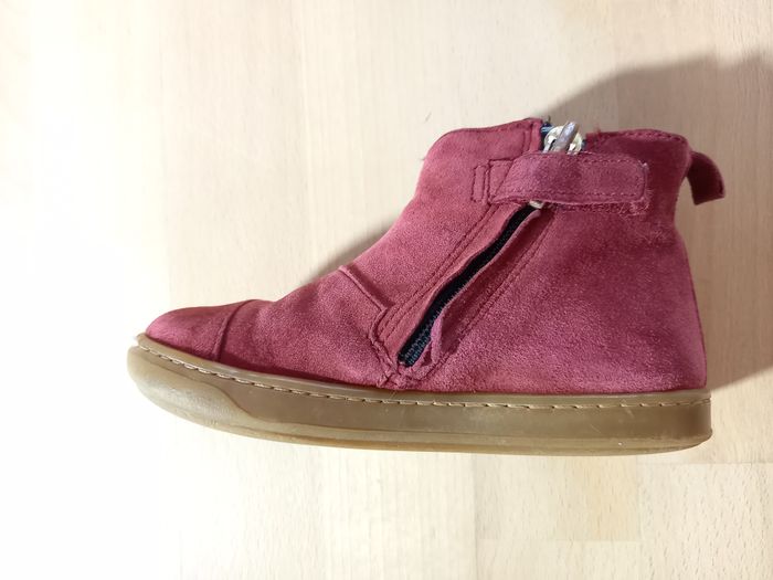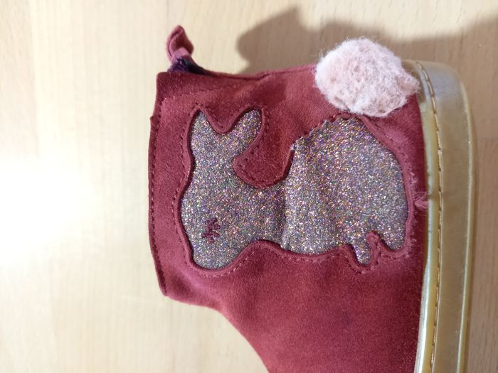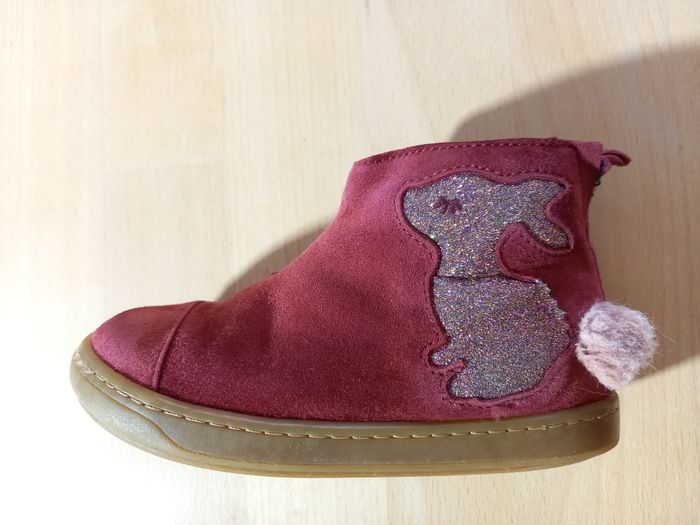 Chaussures, bottines de la marque Shoo pom pointure 25, en très bon état. Modèle Bouba Pimpin 🐰 Acheté en magasin spécialisé à 85€ Saison: automne/hiver Modèle tout cuir: revêtement en cuir velours rouge avec lapin pailleté et petite queue en pompon rose toute douce juste ADORABLE! Elles ont été portées régulièrement par ma fille l'hiver dernier, en alternance avec une autre paire. Nombreuses photos disponibles des 2 chaussures sous toutes les coutures pour juger de l'état ;) Description: Cette bottine premiers-pas pour enfants est présentée dans une version en cuir velours rouge, avec un empiècement lapin. Cette chaussure légère et souple est conçue avec des matériaux de qualité pour le bon développement du pied. Sa tige haute permet un bon maintien de la cheville et du pied. Elle se chausse et se déchausse facilement grâce à son zip intérieur. Ce modèle taille petit (prévoir la pointure au dessus). J'ai beaucoup d'articles en parfait état ou neufs dans mon dressing, allez y faire un tour! Je propose des vêtements, jouets et accessoires, principalement pour fille dans mon dressing, de la taille 24 à 36 mois actuellement. N'hésitez pas à vous abonner à mon profil pour suivre mes nouveautés. Possibilité de faire des lots. Remises activées et frais de port groupés. Livraison rapide et très soignée. Je réponds à toutes vos questions, n'hésitez pas!