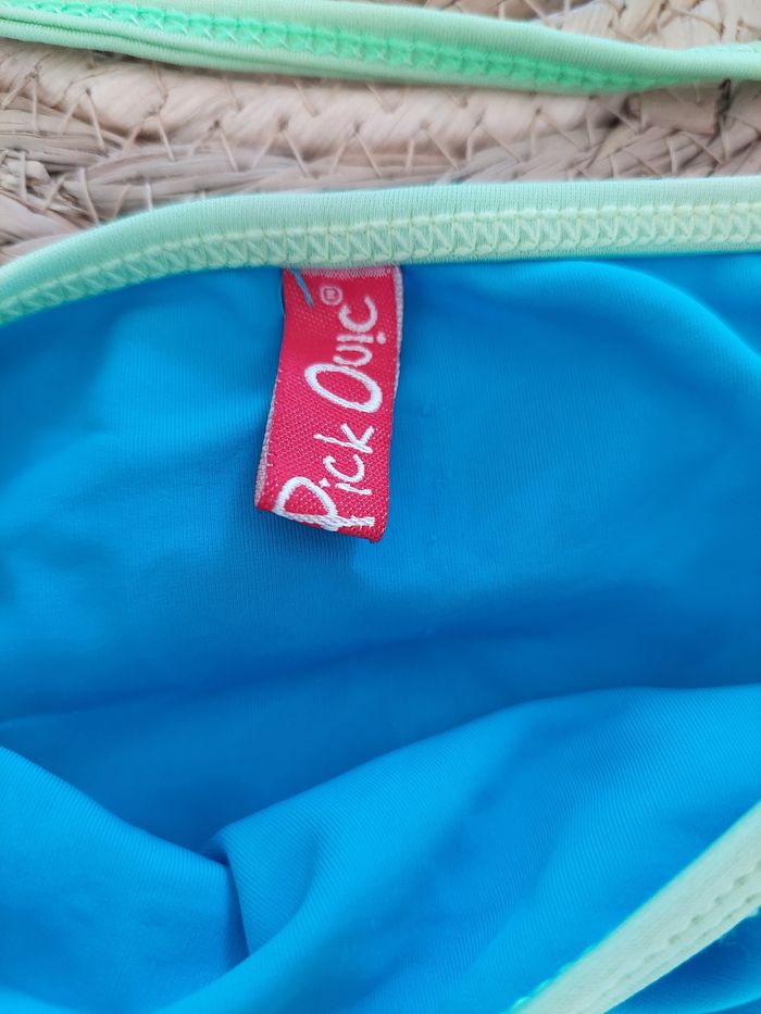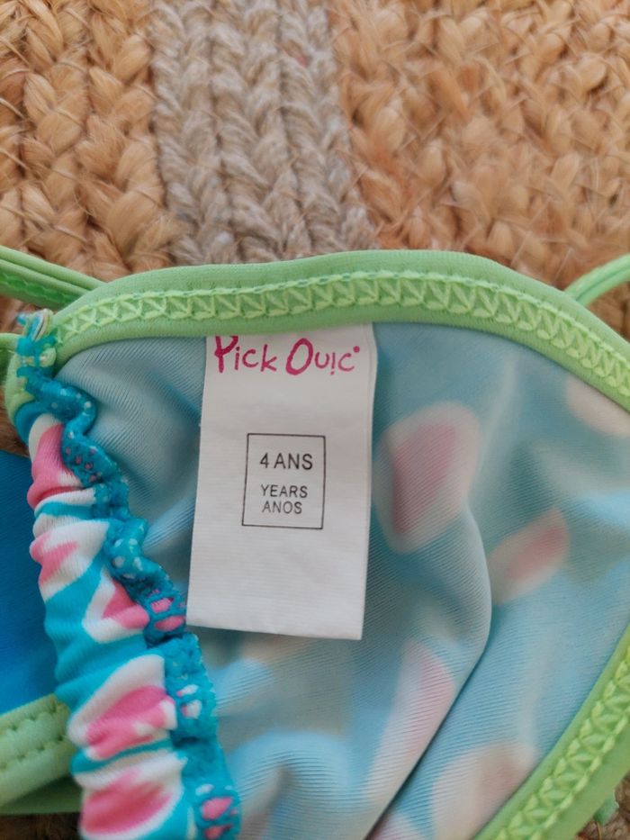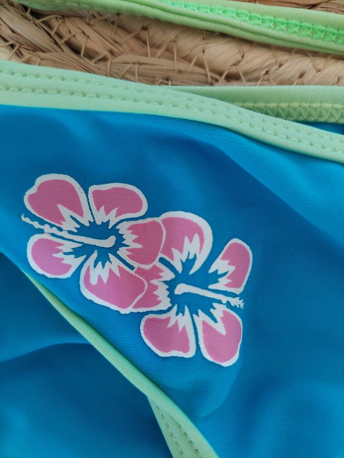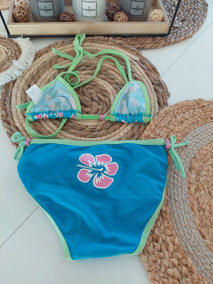 Maillot 2 pièces avec haut triangle. Motif 🌸. Le haut s'attache avec des cordes derrière le dos et derrière la nuque. Nœuds sur les côtés avec perles. Pick Ouic, taille 4 ans #4ansAurelilou34