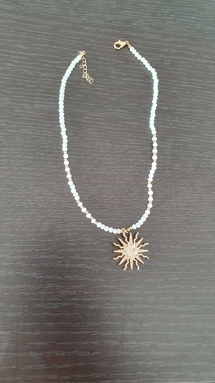 Je vends ce collier neuf avec un pendentif soleil et lune et des perles blanches.