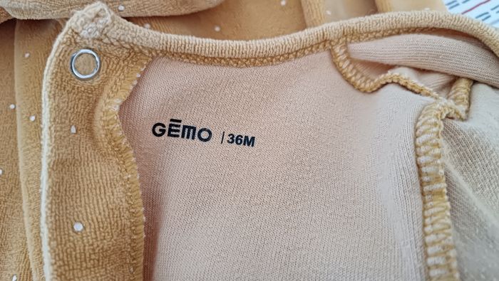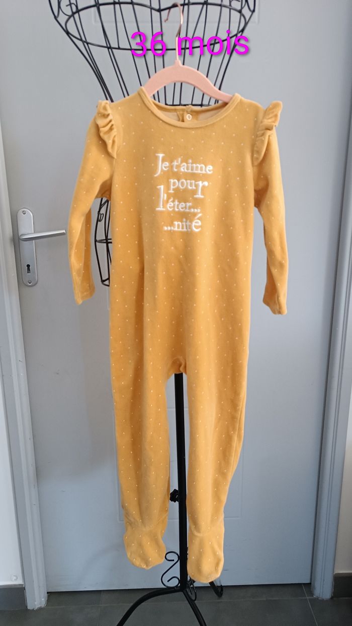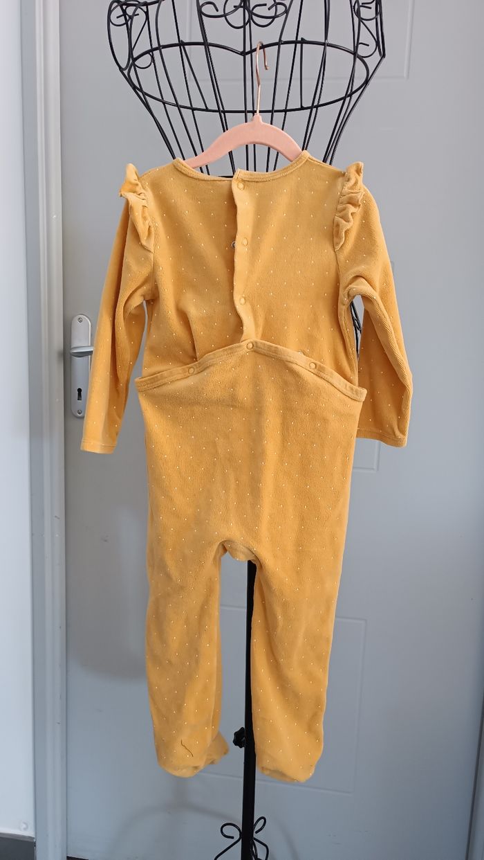 Grenouillère en velours jaune et blanche, ouverture a l arrière, taille 36 mois, de marque Gémo, neuve. Possibilité de faire des lots