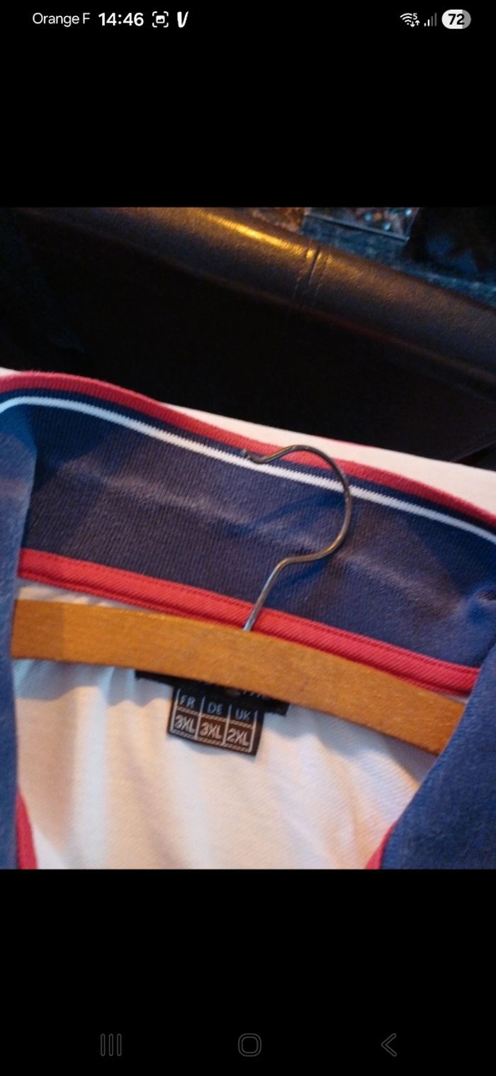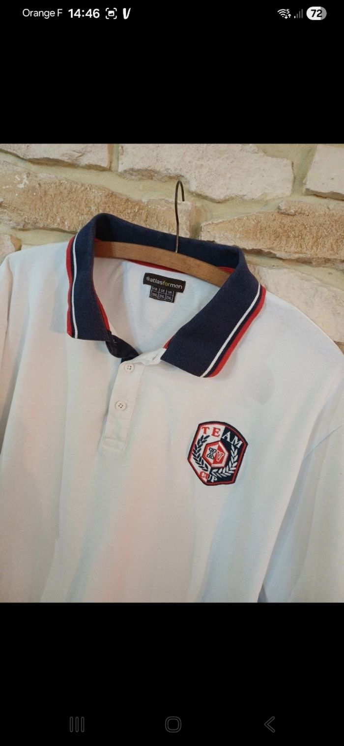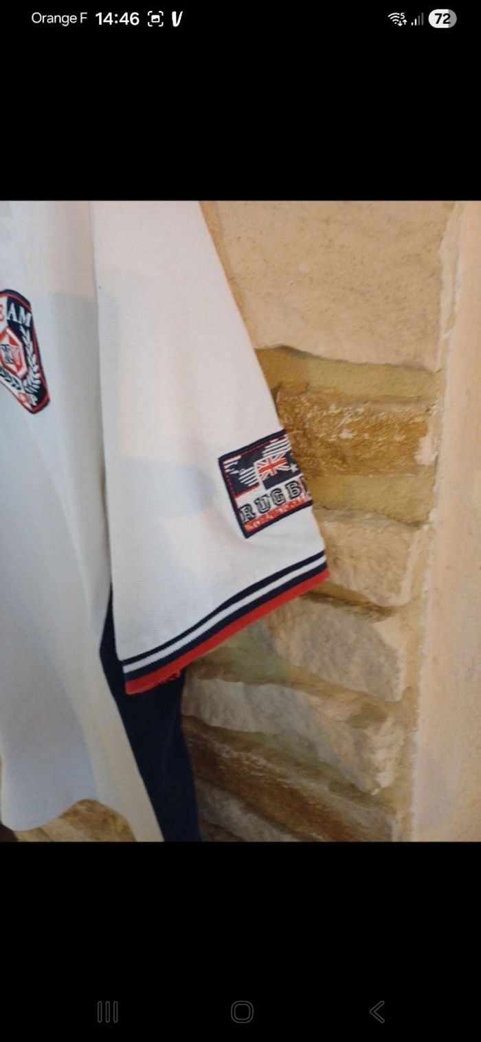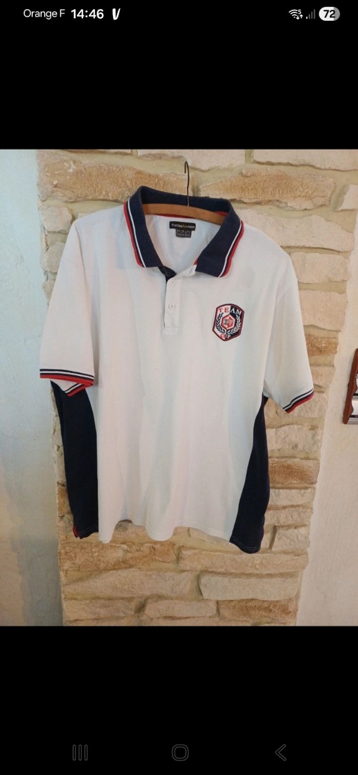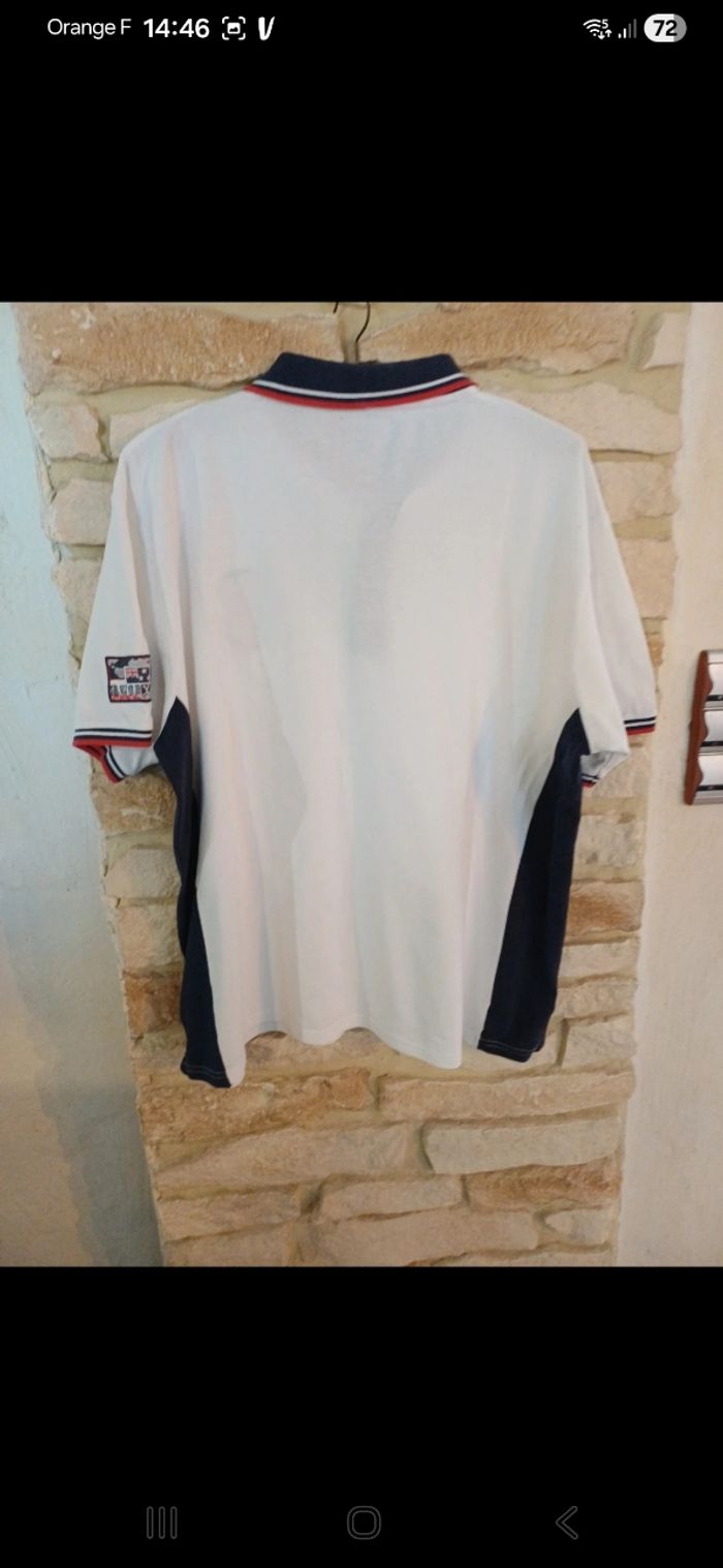 Polo manches courtes avec écusson à l avant et sur une manche. En très bon état sauf au niveau de la pliure du col , qui est décoloré