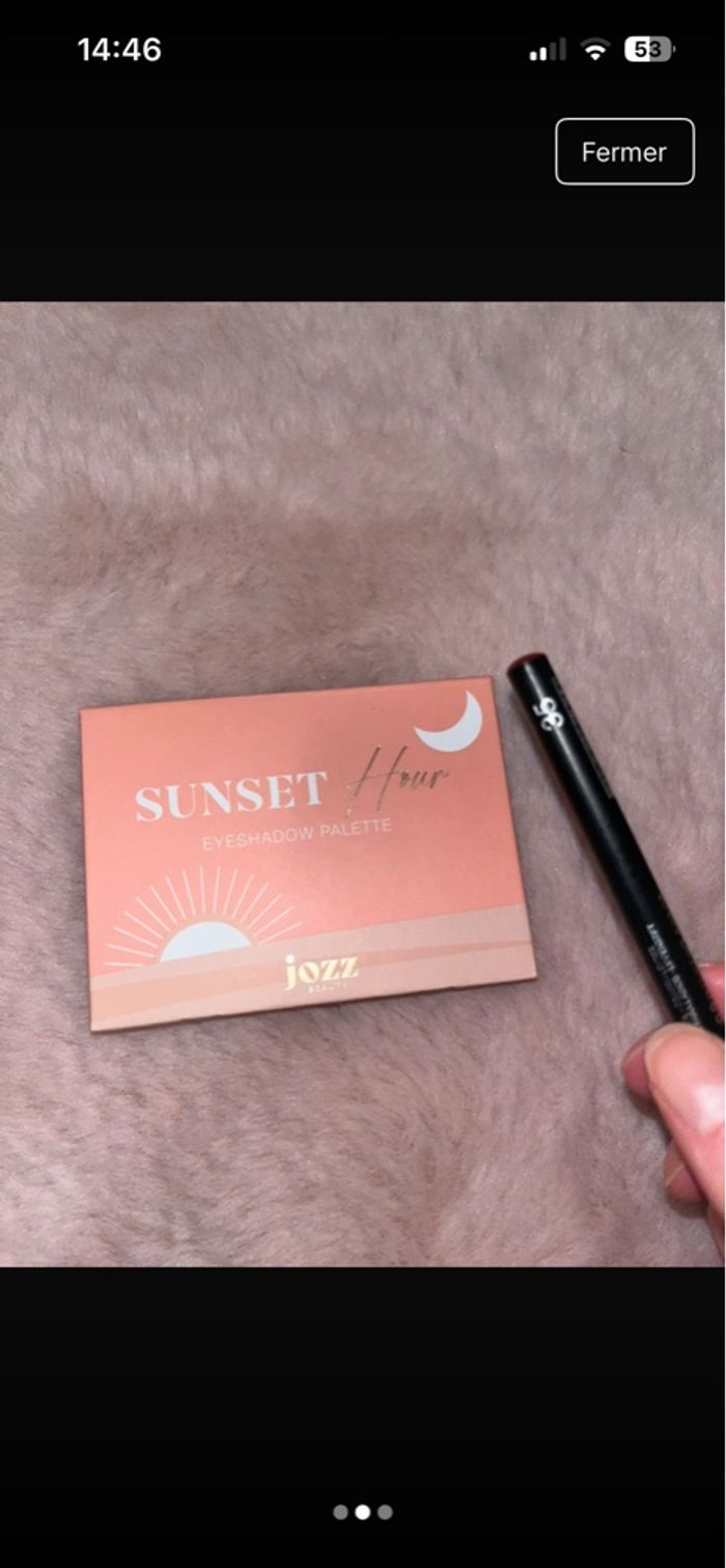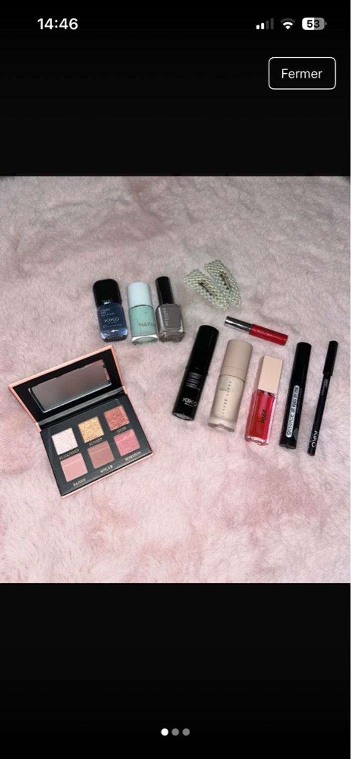 Ce lot comporte : • Une base fenty beauty • Un highlighter doré et un crayon lèvre kiko . Un mascara noir essence . Une palette yeux et un gloss Jozz beauty • Un gloss nocibé • Trois vernis