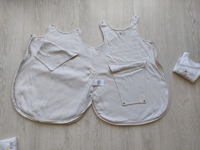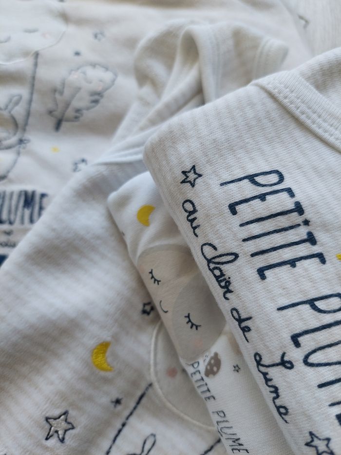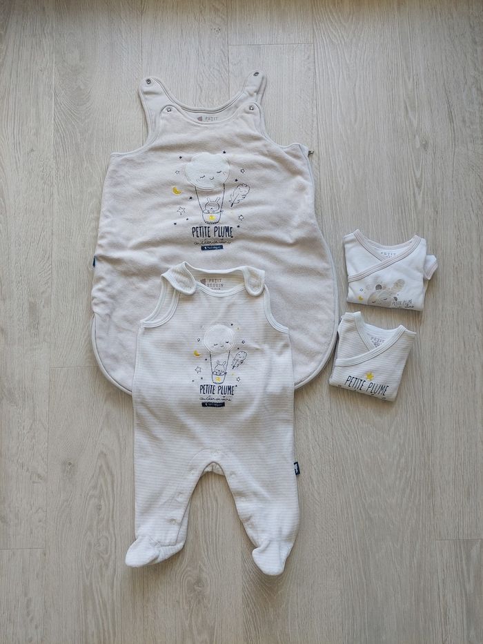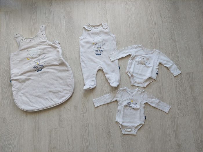 Lot de 4 pièces ( 2 bodies, un pijama, une gigoteuse) 1 mois / 56 cm Usure au niveau des boutons pression de la gigoteuse