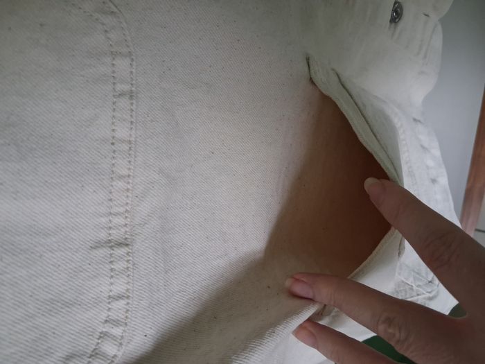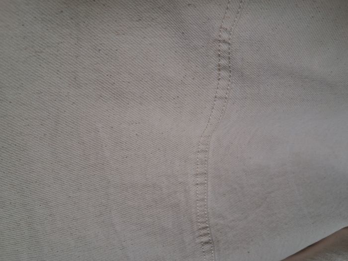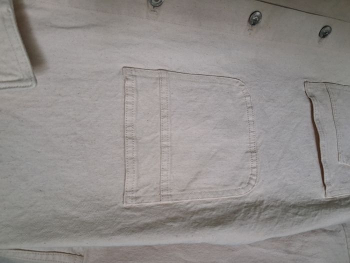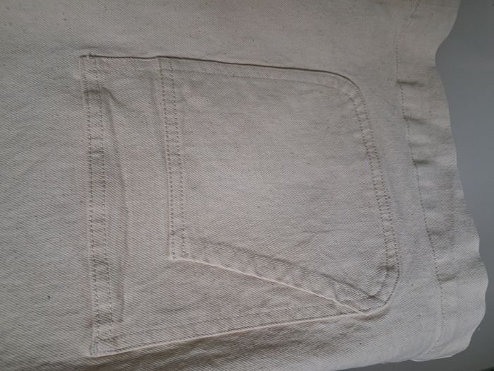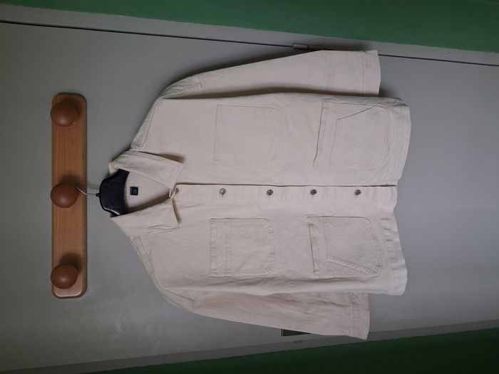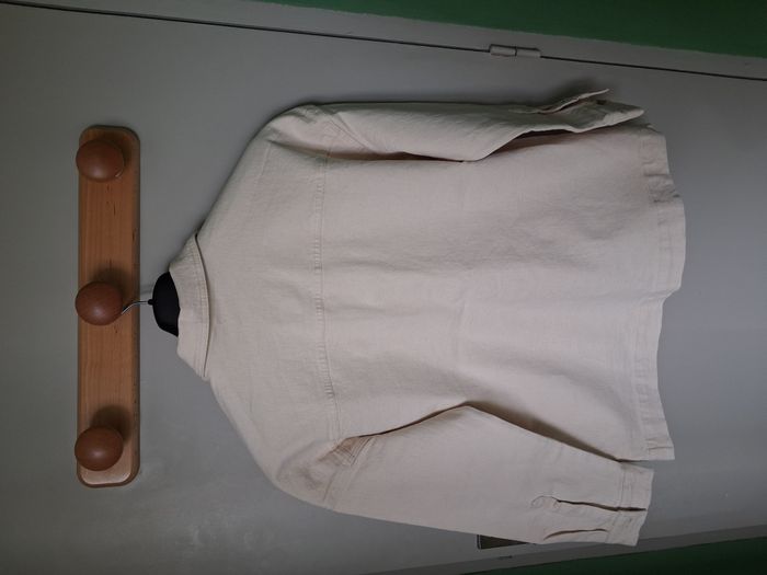 #alexamaya_femmeL Veste : * Effet veste en jean * Couleur : blanc cassé * Ouverture : boutons sur le devant au milieu * Col * 4 poches sur le devant Dimensions : (approx.) Haut du col jusqu'en bas : 73 cm Aisselle à aisselle : 63 cm Portée 1 ou 2 fois Taille : L - 42/44 Marque : Kiabi Composition : 99 % Coton - 1% Elasthanne