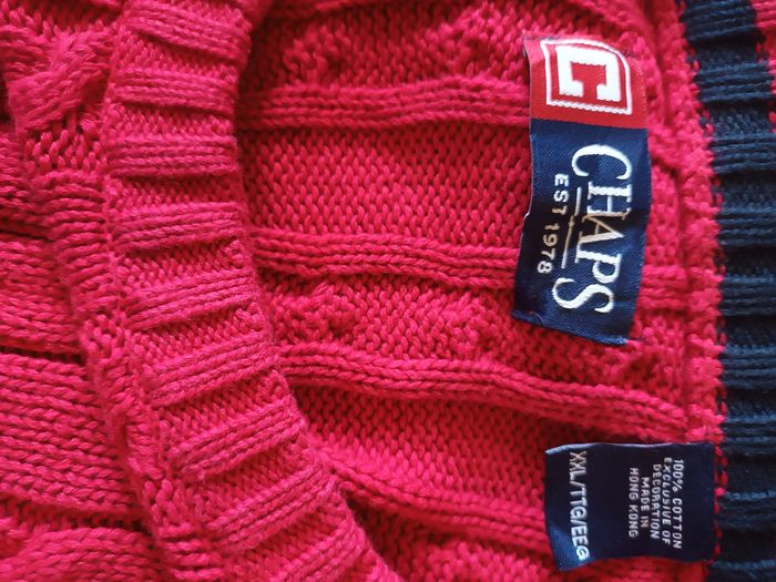 Pull CHAPS, taille XXL 100% coton, maille torsadée. Bon état , présence de deux petits trous visibles sur les photos