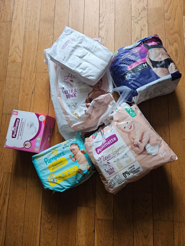 Lot de couches de tailles nouveau né, taille 1 (ils sont rangés dans un sachet de taille 2 mais il s'agit bien de taille 1) et taille 2 (ils sont rangés dans un sachet de taille 3 mais il s'agit bien de taille 2). Principalement de la marque pommette mais il y a un paquet de pampers. Une boite de coussinet entamée. Un paquet de couches post accouchement entamée. Les sachets sont ouverts mais je ne m'en suis quasiment pas servi ou alors mon bébé a grandi trop vite 🙈