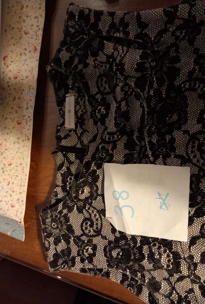 Étiquette de taille coupée, mais équivalent 38 Découpes originales sur le côté gauche du décolleté Robe cintrée Zippée dans le dos Marque : Cache- Cache De nombreux autres vêtements adultes diverses tailles dans ma boutique.