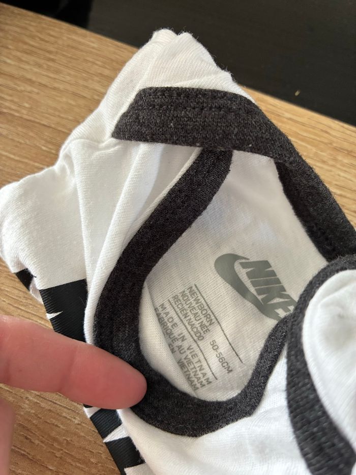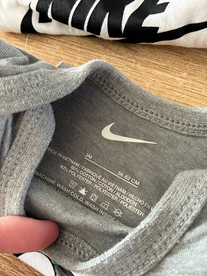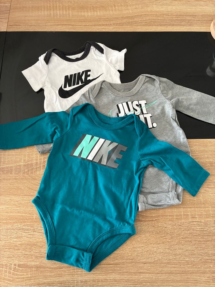 Lot de 3 body Nike, jamais porté. 1 manches courtes et 2 manches longues. Body blanc : 0-1 mois. Body gris + bleu : 3 mois.