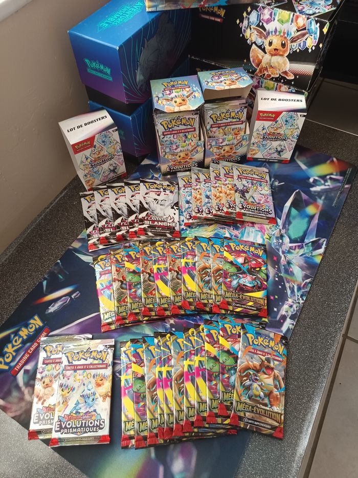 Ne pas acheter l'annonce 20 Évolutions Prismatiques Ev8.5 21 Mega-évolution ME01 5 Flamme Blanche Ev10.5 6€ Le Booster si tout le lot est pris 7€ Le Booster au détail Merci de me contacter en message