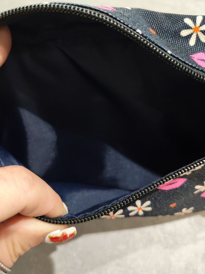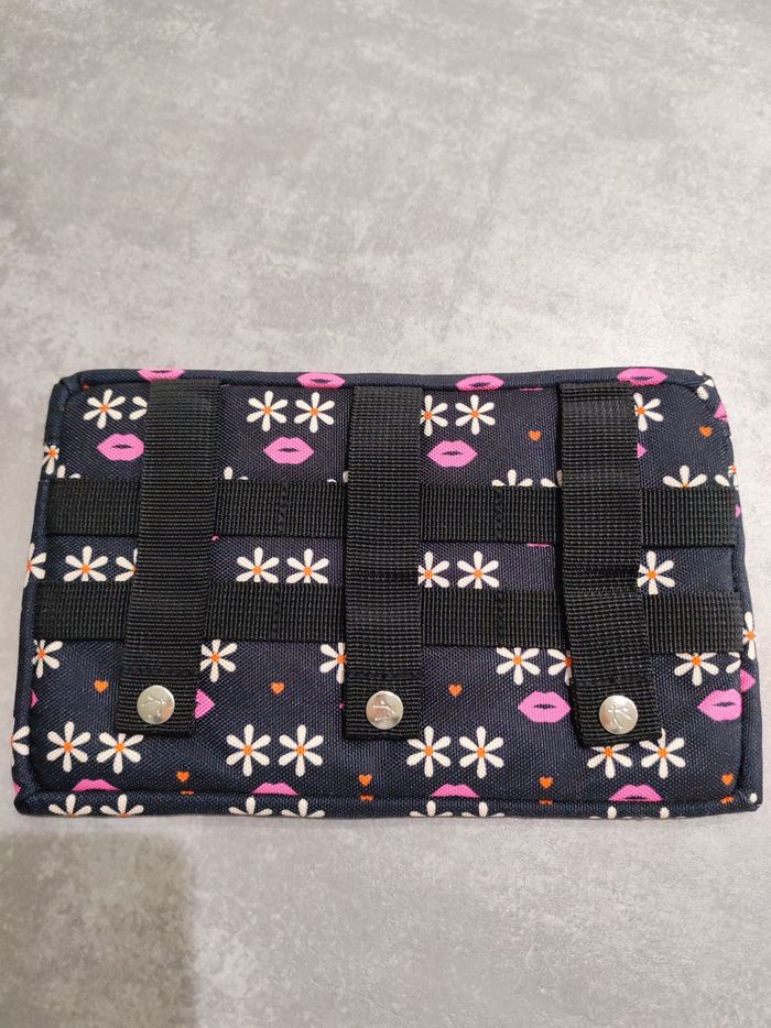 Pochette de marque Cabaïa, jamais servie De couleur noir, rose, crème et orange, intérieur bleu marine. Dimensions longueur 25cm, hauteur 15,5cm.