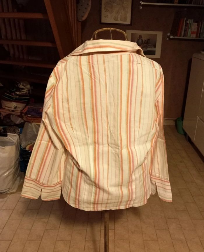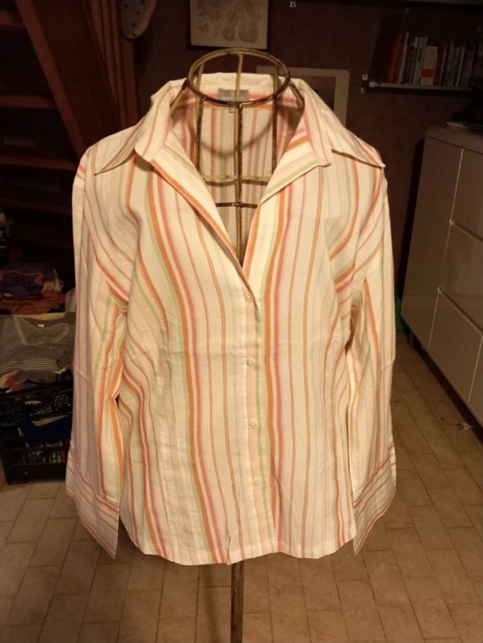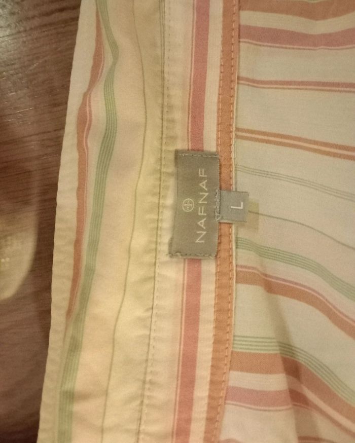 Manches 3/4 Portée quelques fois Couleurs des rayures : marron, rose, vert (sur fond blanc) Marque : Naf-Naf Taille : L 57% coton et 43% polyester De nombreux autres vêtements adultes toutes tailles dans ma boutique