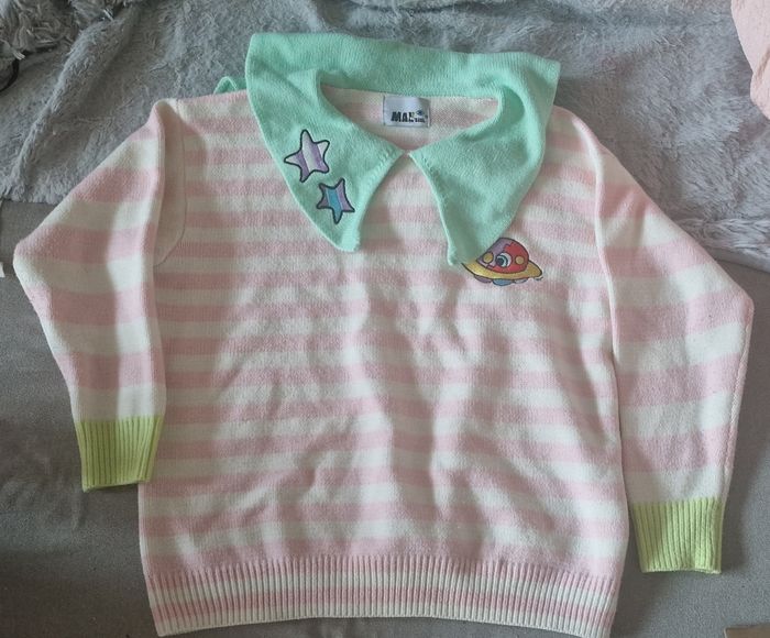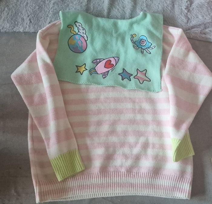 Bonjour, je vends mon pull motifs "espace". Peu portée, à part quelques peluches a enlever, très bon état. Taille unique correspondent à un M légèrement oversized.