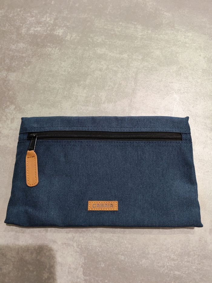 Pochette de marque Cabaïa De couleur bleu jeans brut, intérieur bleu marine. Dimensions longueur 25cm, hauteur 15,5cm. Neuve, jamais utiliser