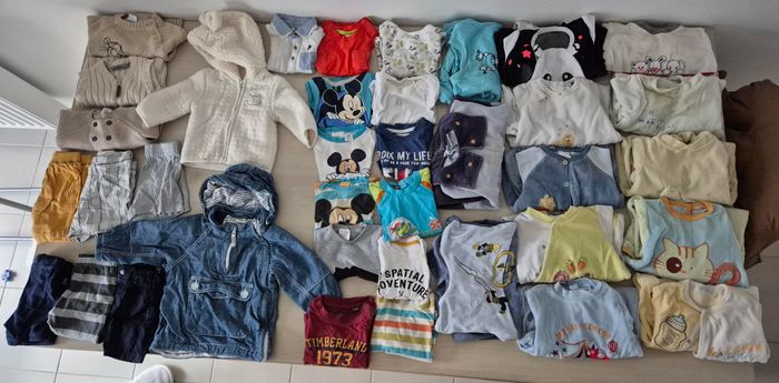 Salopette, pantalon, short, chemise, pull, vestes, tee shirt mc Ml, pyjamas. Bodys, 44 pièces Disney, orchestra, timberland, tape a l'œil, h&m kiabi Vetements d'occasion, pouvant comporter des traces d'usure
