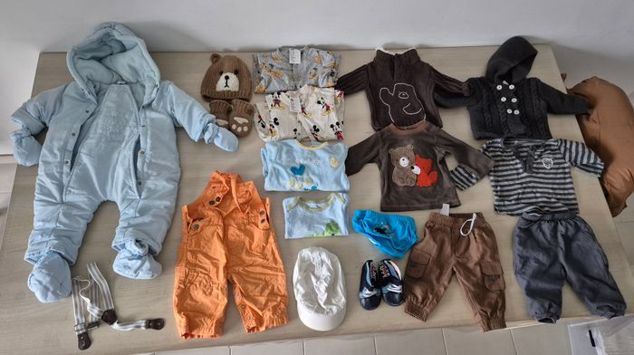 Pantalons, pulls, tee shirt ml, pyjamas, body, salopette, combipilote, bretelle, chaussure, casquette, bonnet moufles. Slip de bain Disney 17 pièces Vetements d'occasion pouvant comporter des traces d'usure