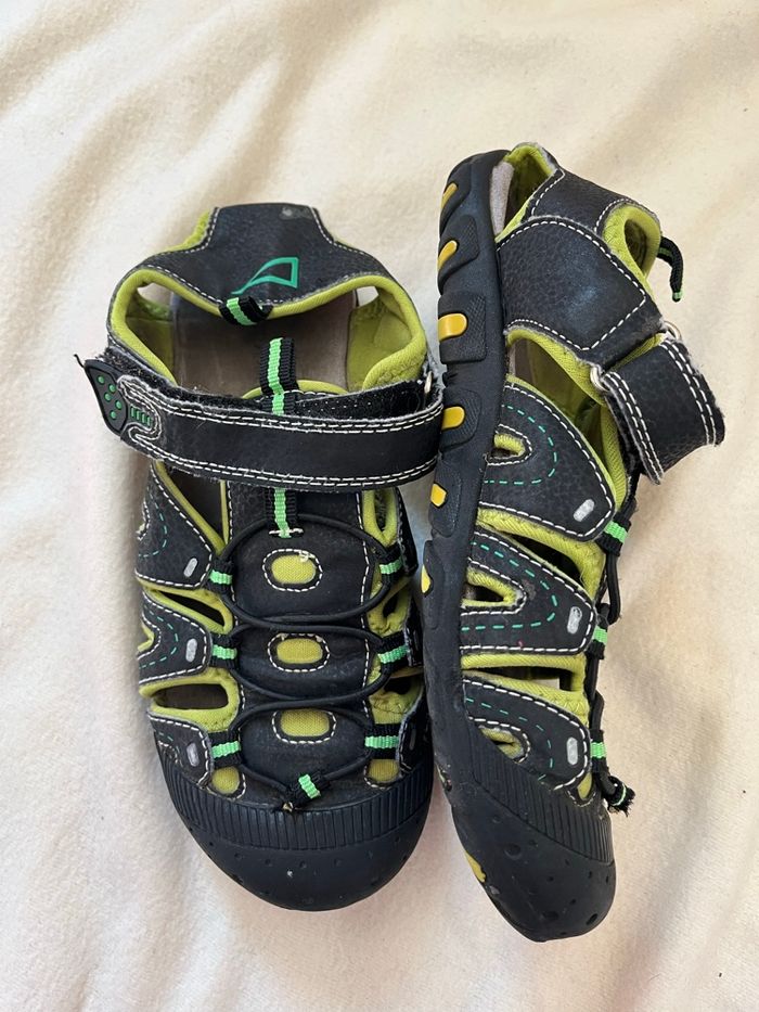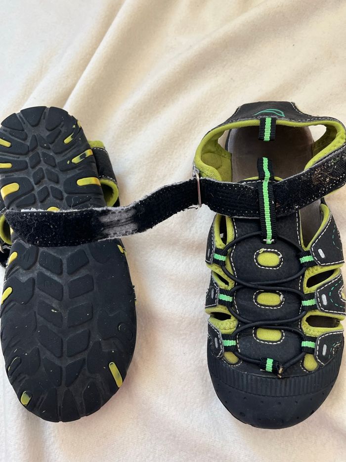 vend cette paire de sandales de couleur noire et verte marque le trappeur longueur de la semelle 22 ce qui est correspond à la taille 34 à 35 Petit usure d’un scratch comme montré sur la photo 2 euros Les autres annonces de chaussures du au #lma42shoe34 #lma42shoe35