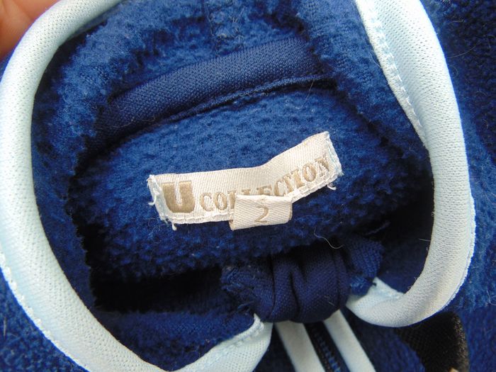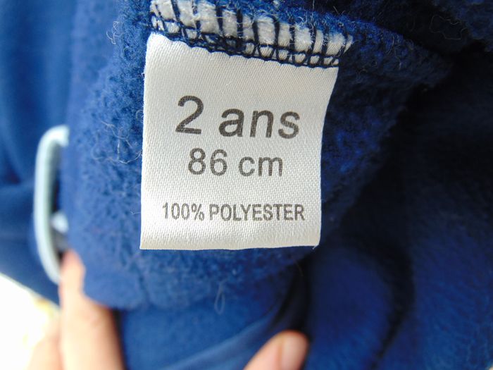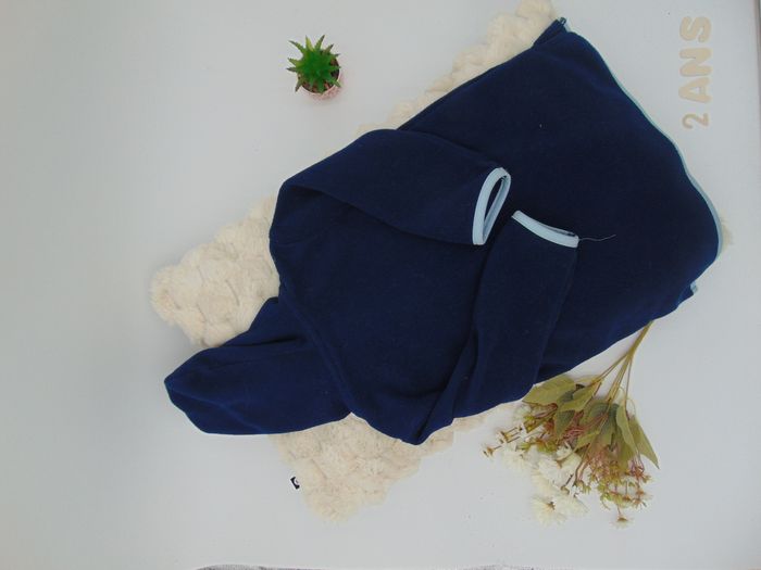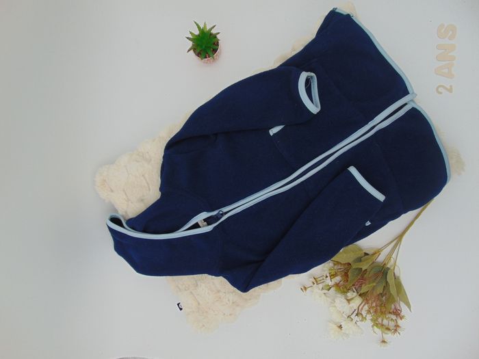 - A capuche - Matière polaire - Zippée - Bleue marine - Bordure des poignets, de la capuche et de la fermeture éclair bleue claire - Aucune tâche ni trou