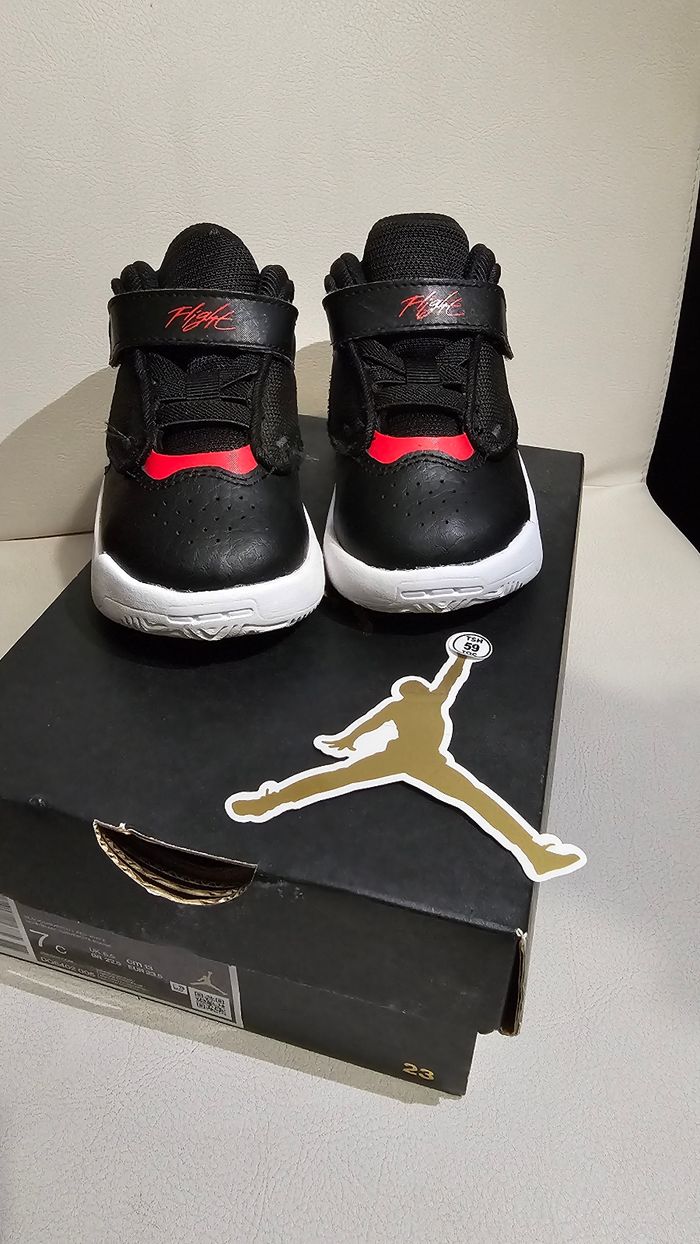 Baskets Jordan Max aura enfant mixte en parfait état avec sa boîte d'origine. Taille 23.5 adapté pour les pieds des touts petits tout en gardant le style.