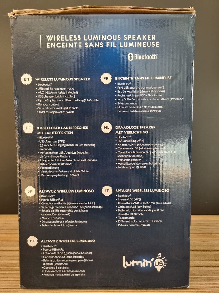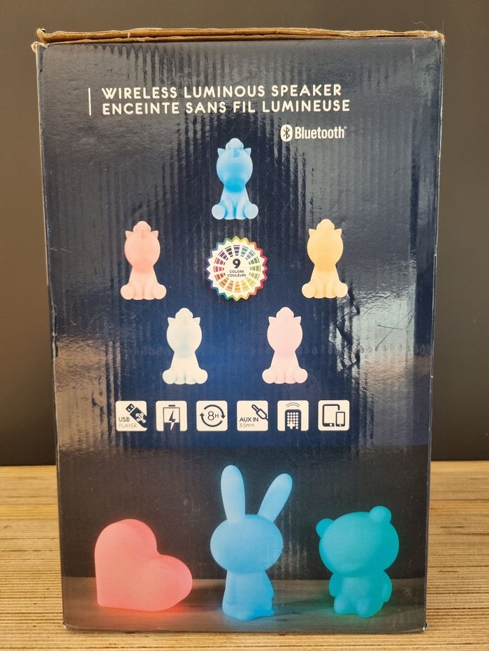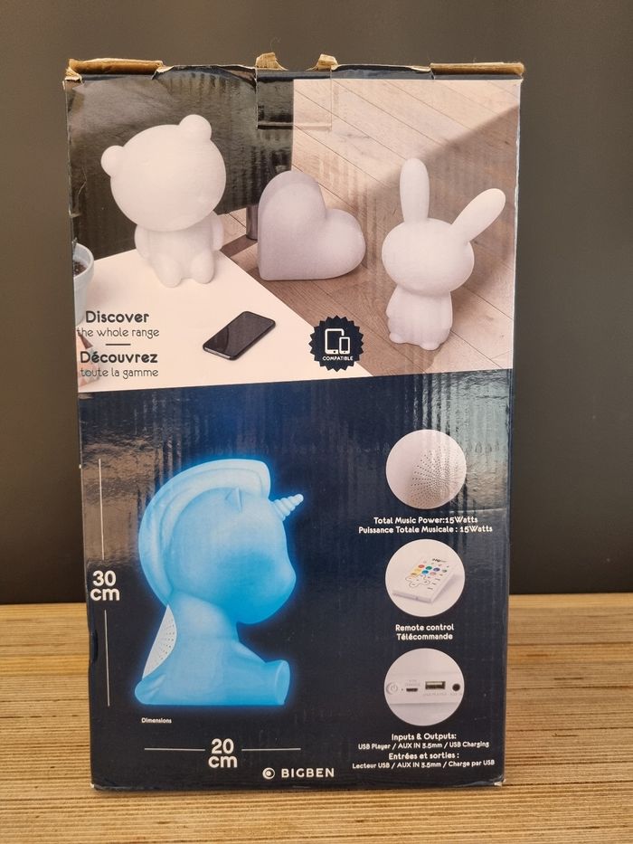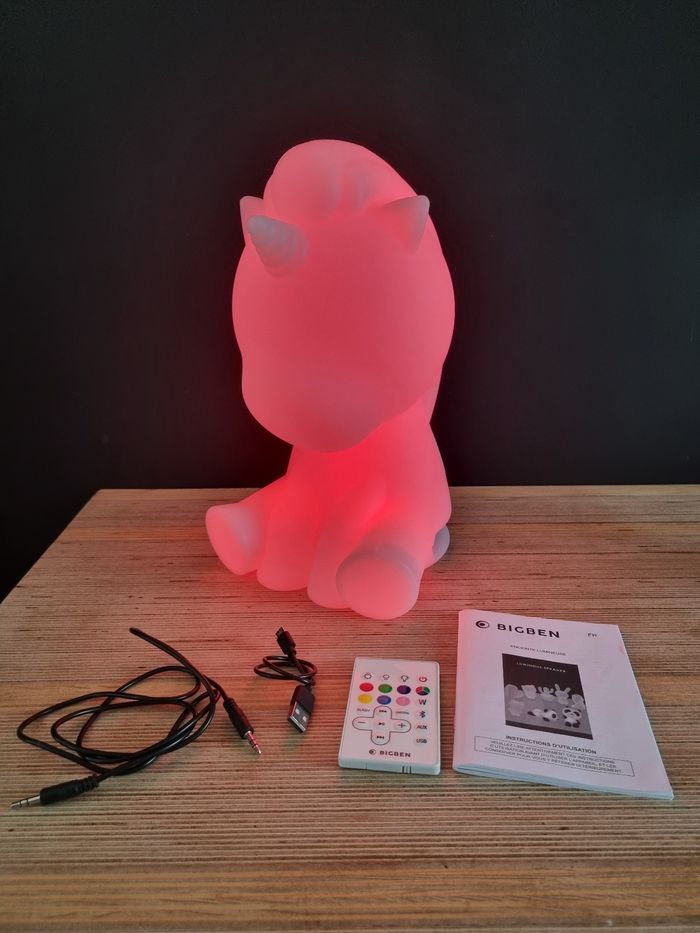 En excellent état, comme neuve ! Description : Cette enceinte lumineuse bluetooth licorne Lumin’US sera le compagnon préféré des petits et des grands enfants. Elle vous accompagnera en tant que veilleuse pour des nuits plus paisibles et animera vos soirées. Grâce au bluetooth, elle diffuse la musique de votre portable ou de votre tablette, sans fil. Vous pouvez également diffuser de la musique via l 'entrée auxiliaire 3.5mm, ou des MP3 sur une clé USB grâce à la prise USB intégrée. La télécommande fournie permet de contrôler la musique et les effets lumineux (variation des couleurs par exemple). Cette enceinte fonctionne sur secteur ou sur batterie (jusqu'à 8h d'autonomie).