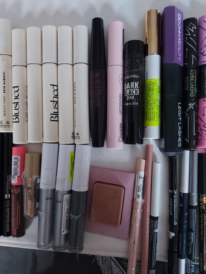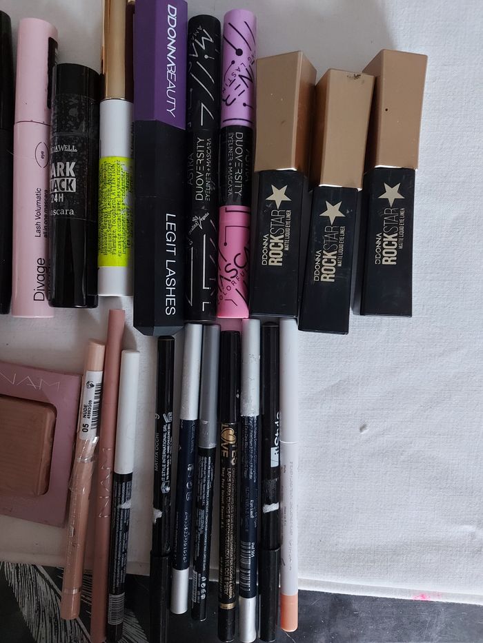 Lot de maquillage pour les yeux, ATTENTION, les maquillages ont subi le transport et l'entreposage. Certains se sont ouverts et peuvent etre secs, d'autres sont cassés, d'où le prix mini. Comprenant : Gels sourcils, crayons sourcils, mascaras, eye liners. Bien que le tout soit mal conservé et est abîmé, le tout est neuf