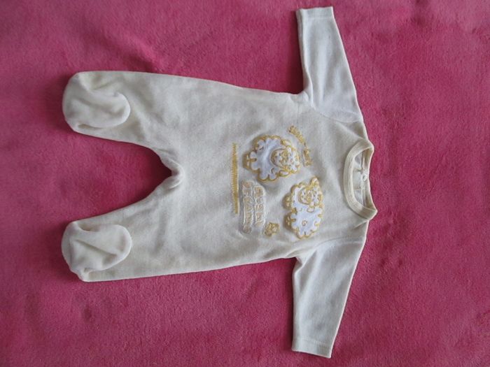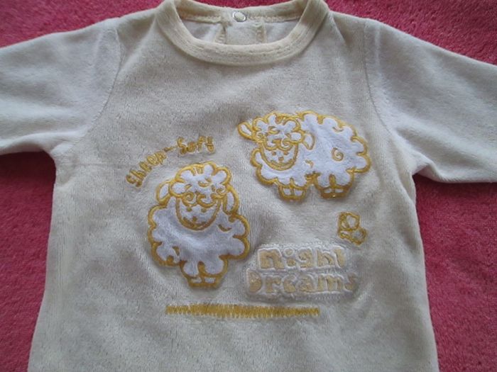 Vends pyjama jaune. Motifs moutons. Taille 1 mois. Excellent état. Pour plus de choix, allez consulter mes autres annonces.