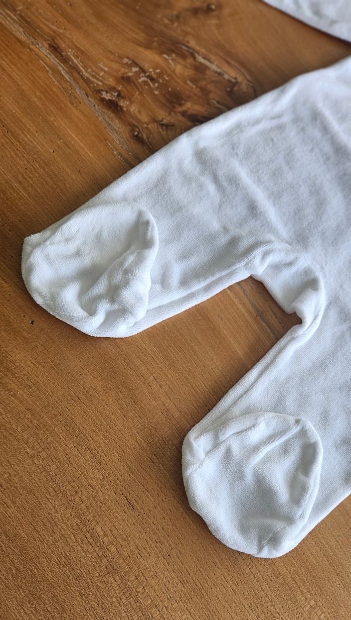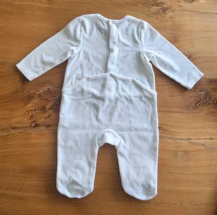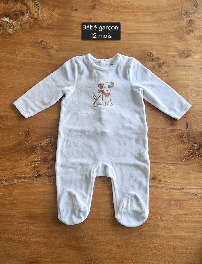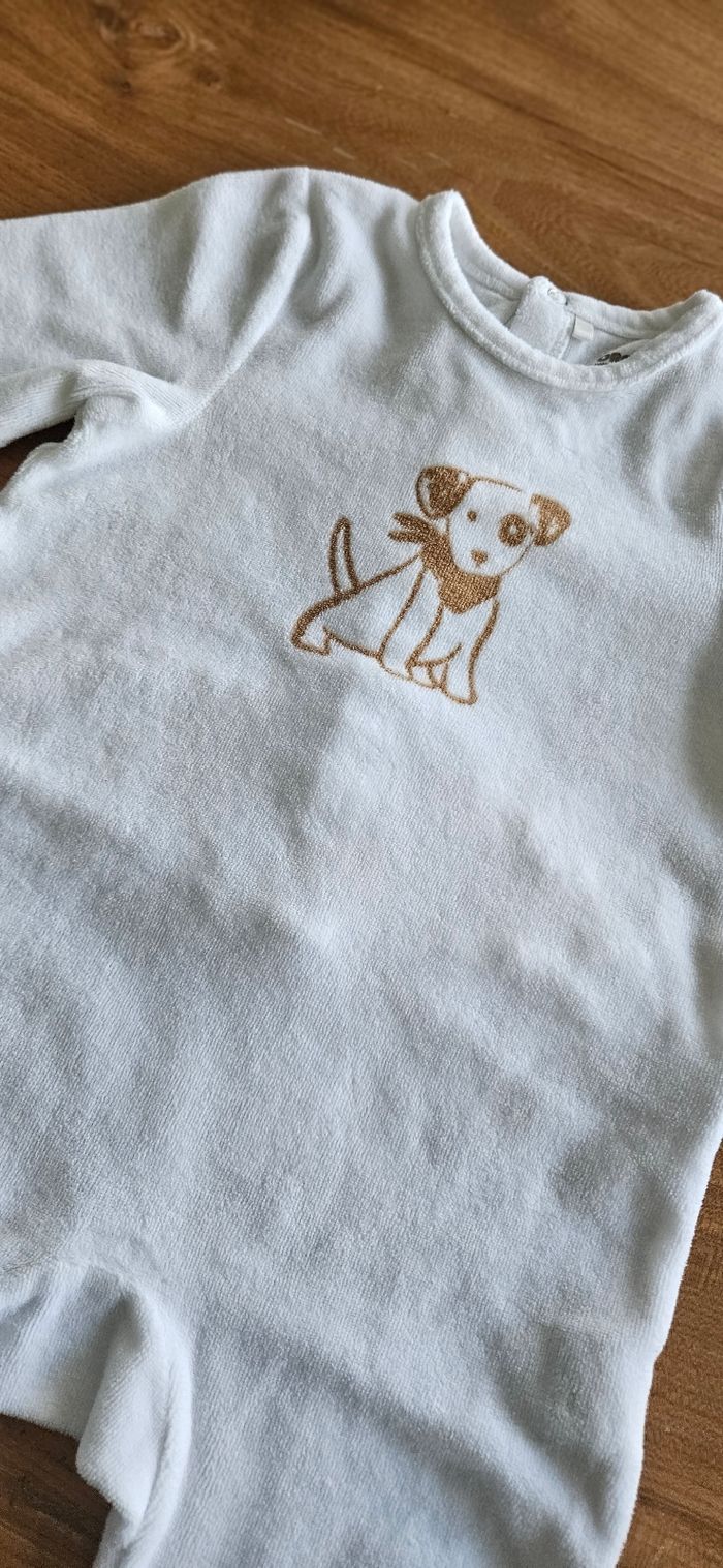 Pyjama chaud bébé garçon, de couleur blanc. Dessin d'un chien marron imprimé sur le devant. Ouverture pressionnée dans le dos. Porté mais reste en très bon état. Aucune tâche, ni trou 👌
